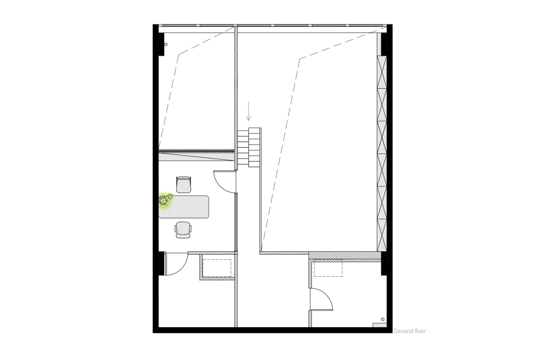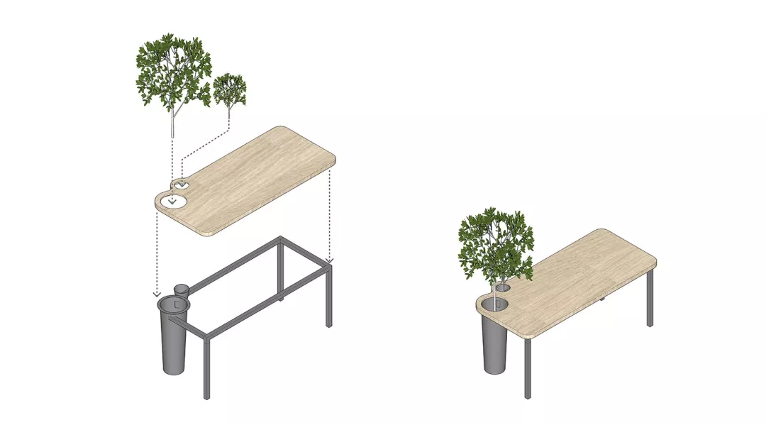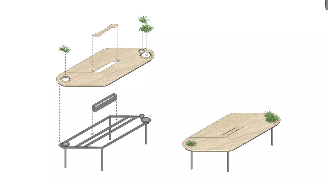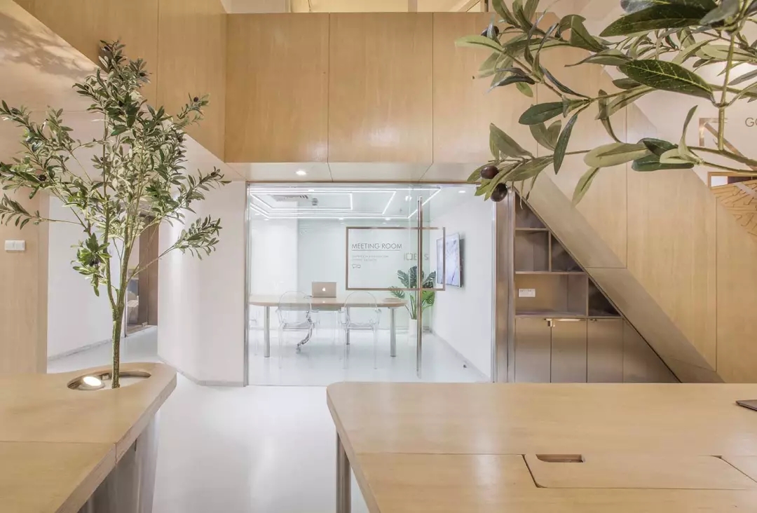 同時我們希望有一個張別具一格的會議桌,但是會議桌極強的功能性使得難以去進行改變。于是,會議室空間本身的形狀缺陷成了這張桌子想法的起點。由于避讓入口玄關(guān),會議室空間有一個角是切掉的,墻壁是斜著放置,如果是長方形的會議桌,就必然在這個斜墻前造成使用空間不夠缺陷,無法坐人.所以就產(chǎn)生了一個平行四邊形的會議桌,斜邊與空間的斜墻平行,也讓整個斜墻前的空間可以坐下一個參會者,再嵌入一些小草,一張獨特又實用的會議桌就出來了。
