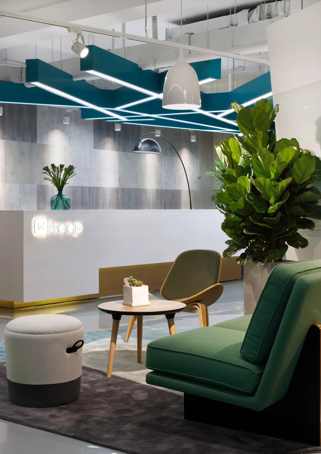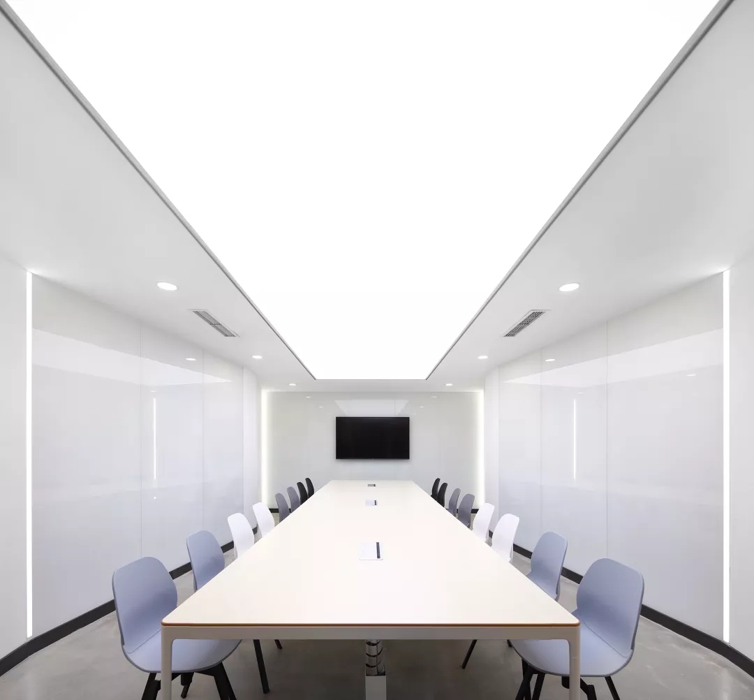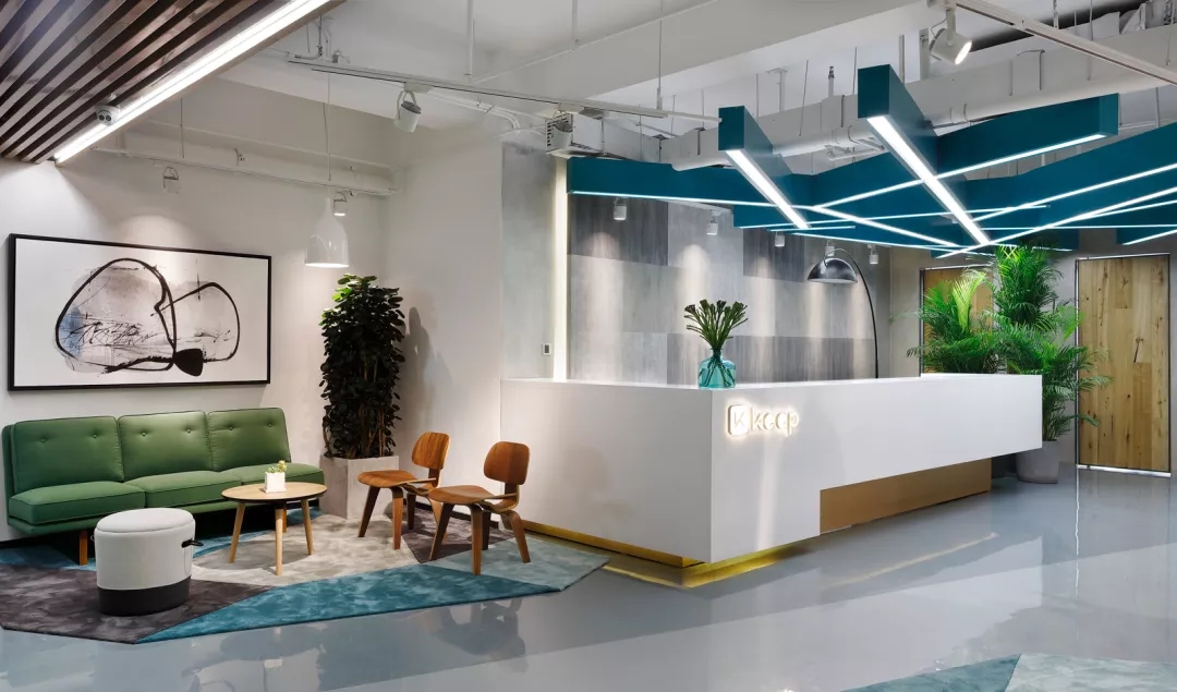 靠近電梯入口的前臺通過頂部的放射狀線條設(shè)計產(chǎn)生視覺延伸感,兩側(cè)區(qū)域通過軟裝陳設(shè)實現(xiàn)多層次的空間,靈活滿足接待、等候、會議及咖啡茶點的各種需求,員工和來訪人員各取所需互不干擾。