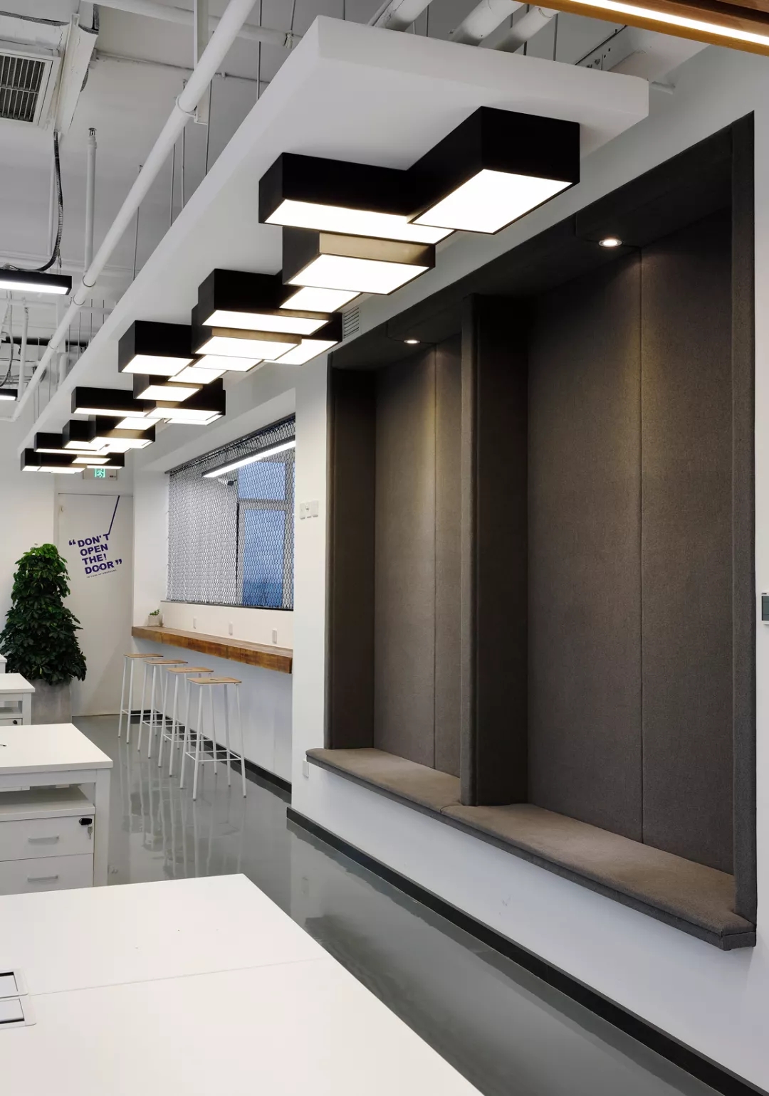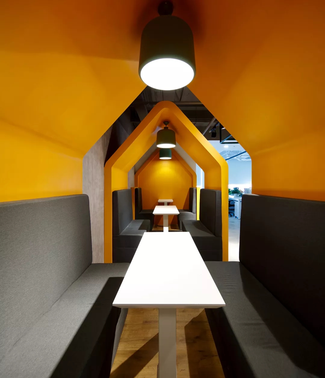 最新完成的整層辦公區(qū)延續(xù)了主體風(fēng)格,少了花俏的點綴,更多地使用色彩碰撞來提振精神,比如亮橙色開放會議間與品牌VI的臟灰色搭配。也首次嘗試了全白色調(diào)的通透會議室,算是對極致風(fēng)格的小探索。