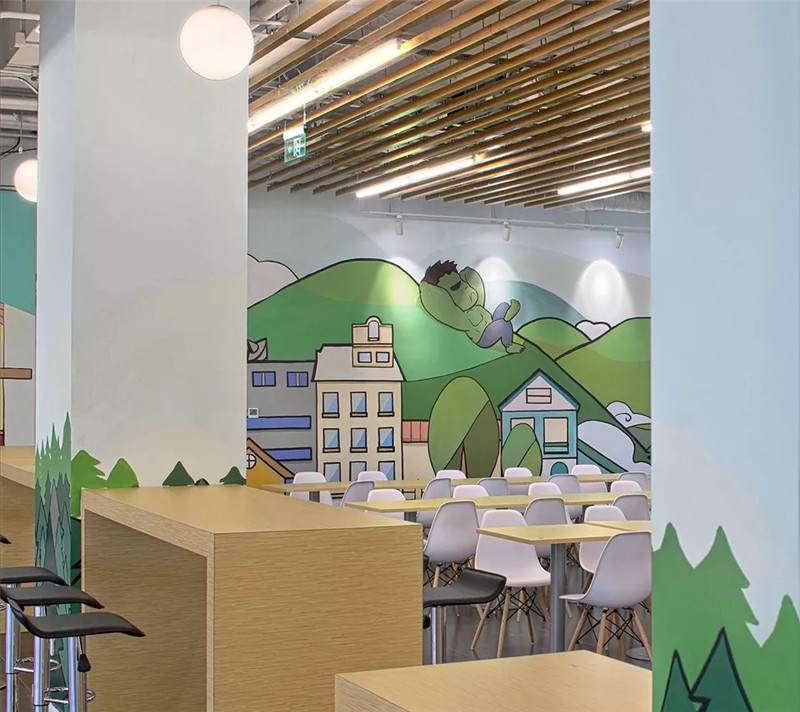 空間氛圍不同,所以圖形裝飾也會因地制宜的改變,用暖色更動態(tài)的感覺。繪制的粉筆畫,可以定期的更換,像黑板報(bào)一樣制定不同的主題,它就是一面活的展示墻。
