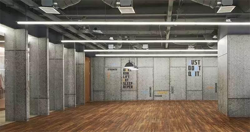 健身房采用的是隔墻類的隔斷,透過隔墻隔斷玻璃能看到核心筒的走道,核心筒的墻面是一幅大型的噴繪畫,結(jié)合立體字,畫面比較震撼,再通過健身房往外看就會產(chǎn)生非常豐富的層次感。玻璃隔斷上也有小的磨砂圖案,形成了戲劇性的效果,使空間的層次更加突出。
