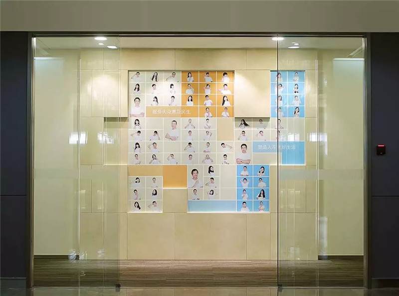這幾張圖比較直觀的說明了第一類、第二類內(nèi)容與公司的企業(yè)文化相關(guān)。例如公司的文化展墻、發(fā)展歷史展示、榮譽(yù)展示部門的團(tuán)建、玻璃隔墻的貼膜裝飾墻面柱體以及部分多媒體科技展示等內(nèi)容相對比較多,也是屬于辦公空間裝修中的環(huán)境圖形的設(shè)計(jì)范疇。