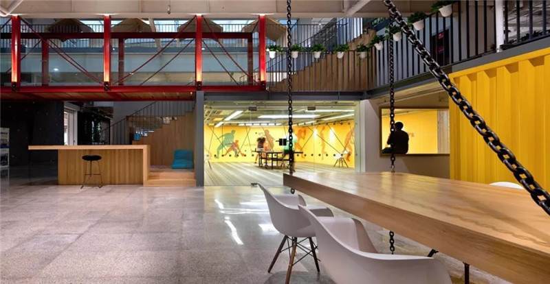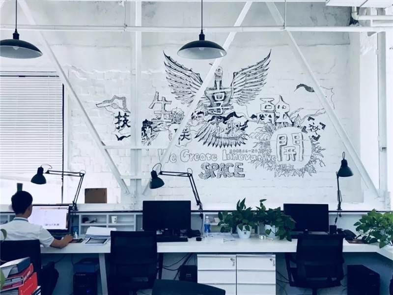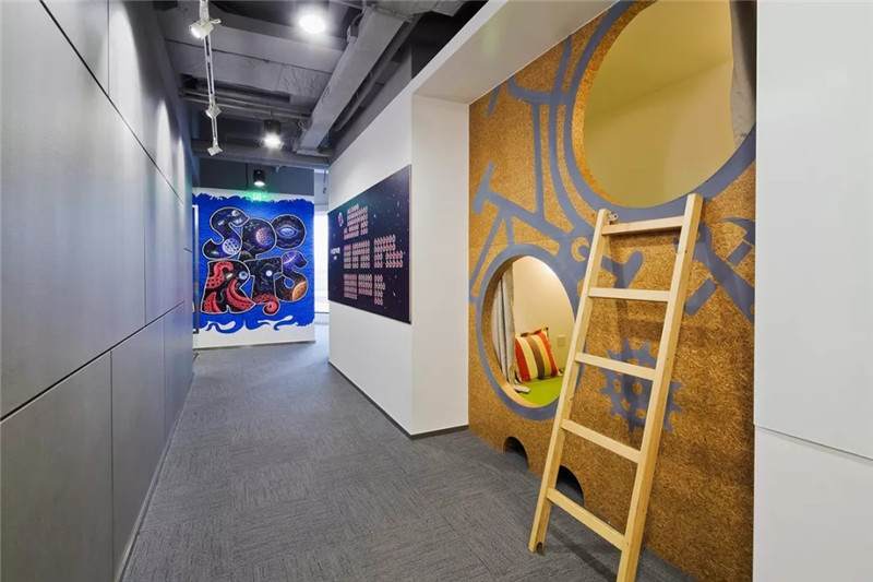 比如這張圖,也是華米科技北京的辦公室,用奧松板開兩個洞,精巧可愛的睡眠艙趴在墻上,利用兩個洞把它組成了自行車的輪廓,超萌的壁畫使墻面不再單一,色彩的對比更加直觀,同時用太空艙的形式增添趣味點(diǎn),不論是做設(shè)計(jì)師還是做工匠,都要秉持設(shè)計(jì)的理念去進(jìn)行選材和制造工藝,把握好每一個細(xì)節(jié)。
