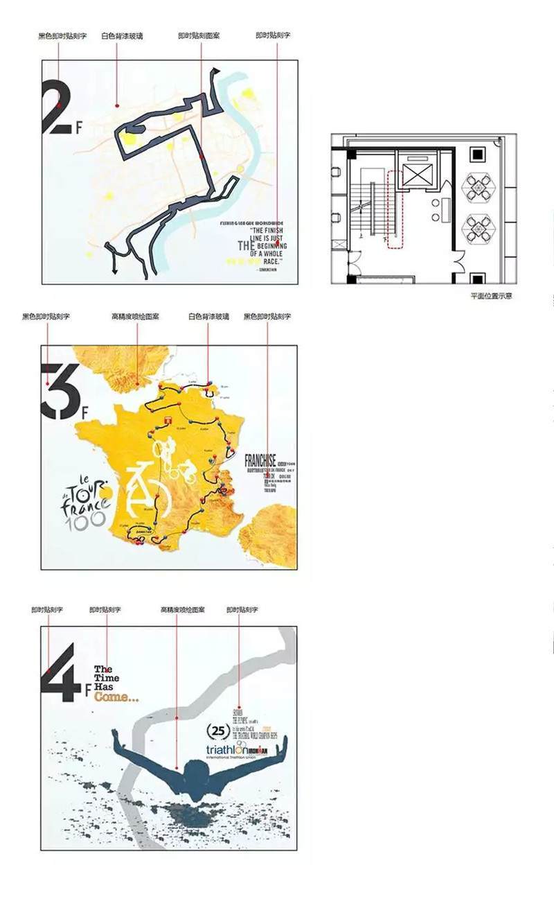 軟裝部分,這是幾層的設(shè)計(jì)稿,不同樓層的導(dǎo)視結(jié)合圖案以及主要的背景墻的主題。當(dāng)時的設(shè)計(jì)文件實(shí)際的完成效果可以看出跟之前的設(shè)計(jì)稿基本上是完全一樣的,設(shè)計(jì)的時候也是因?yàn)槎际怯玫氖噶课募?:1的設(shè)計(jì)小稿,所以能保證完成后的效果。