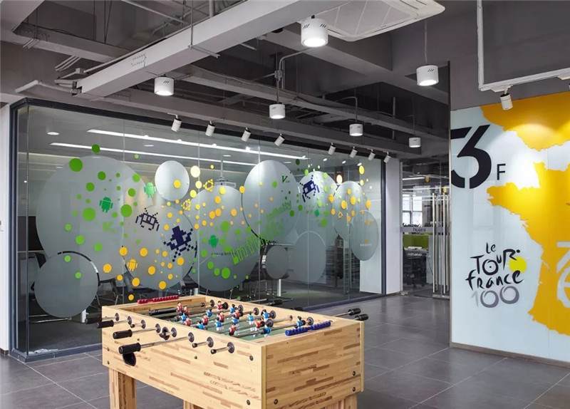 第二張中可以看到,桌上足球,這一張是會議室的玻璃貼膜,最初設(shè)計(jì)的都是一些彩色的圓點(diǎn),但是做完后太通透,起不到遮擋作用,所以現(xiàn)場臨時在玻璃的內(nèi)側(cè)又加了大型的磨砂圓,就有兩層疊加到一起的圖形,磨砂與色彩組合在一起,效果豐富有層次。