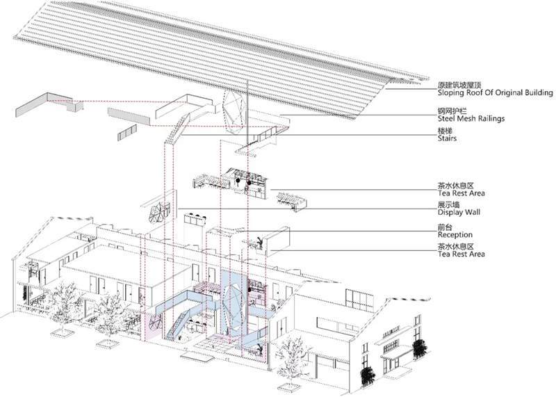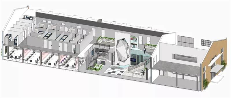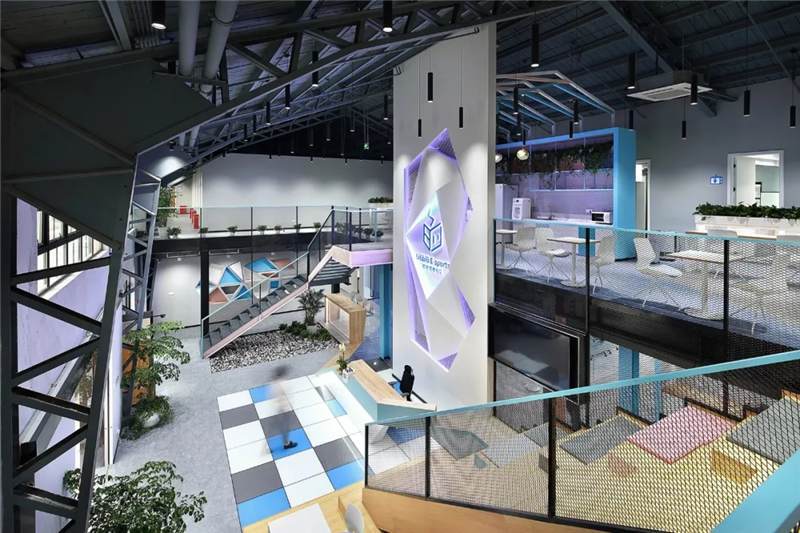 本案位于上海市寶山區(qū)蘊(yùn)川路6號(hào)智慧灣科創(chuàng)園,原建筑為3D打印的廠房裝修,室內(nèi)最高凈高9米,最低6.4米。此空間除原建筑結(jié)構(gòu)墻外,無(wú)任何結(jié)構(gòu)柱與墻體,因此為了更充分合理的利用空間,設(shè)計(jì)師構(gòu)筑了二層,根據(jù)嗶哩嗶哩電競(jìng)的辦公功能訴求,布置空間功能區(qū),即1F分布前臺(tái)區(qū)、會(huì)議區(qū)、茶水接待區(qū)、賽訓(xùn)室、開敞辦公區(qū)、導(dǎo)播室。2F分布就餐區(qū)、住宿區(qū)、導(dǎo)播室等空間。