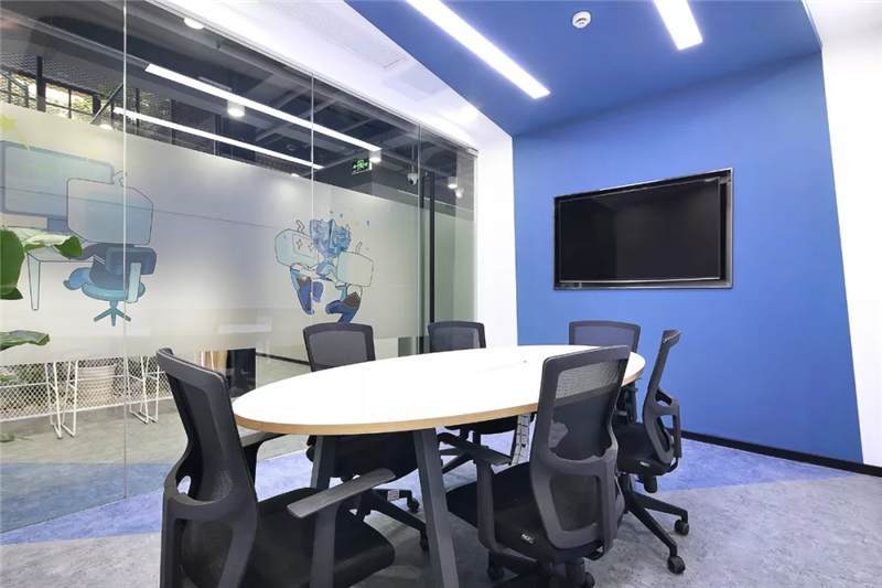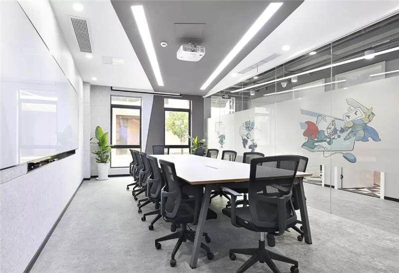 開放辦公區(qū)主體用大量的白色,更加干凈、簡(jiǎn)潔;頂面燈具使用粉色,與其他區(qū)域相呼應(yīng);地面采用兩種地膠拼接,也使得空間更加有層次感。大小不同的會(huì)議空間設(shè)計(jì),運(yùn)用了天花到墻面再到地面的連貫造型,增加整個(gè)會(huì)議空間的靈活性。