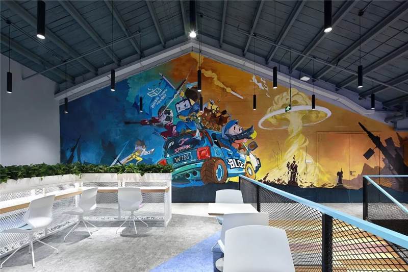 二層大臺(tái)階入口處設(shè)計(jì)師設(shè)置醒目的電競(jìng)主題手繪圖,巧妙的把原本的雙開門變成隱形門,墻內(nèi)部為電競(jìng)導(dǎo)播室。手繪圖豐富的色彩,突出的電競(jìng)主題,卡通的形象,把BILIBILI的風(fēng)格呈現(xiàn)的淋漓盡致。