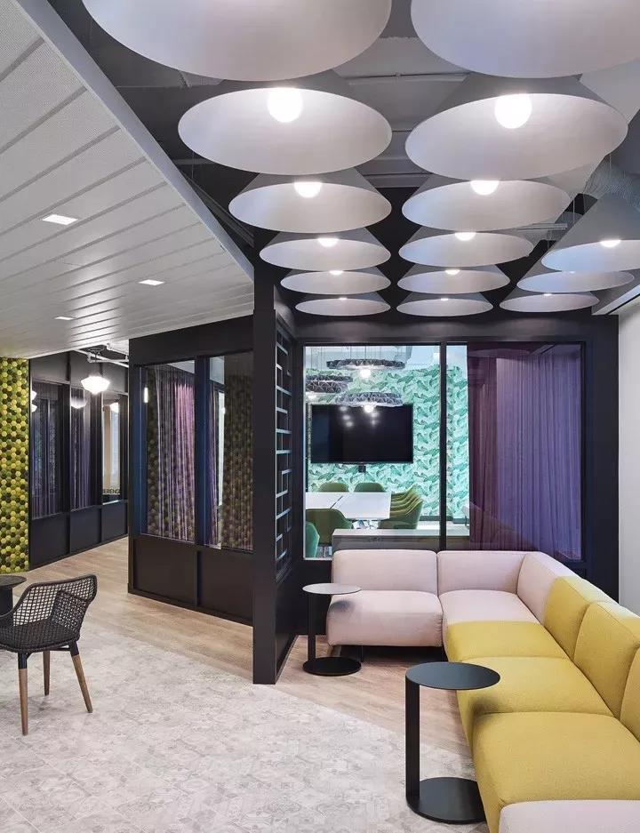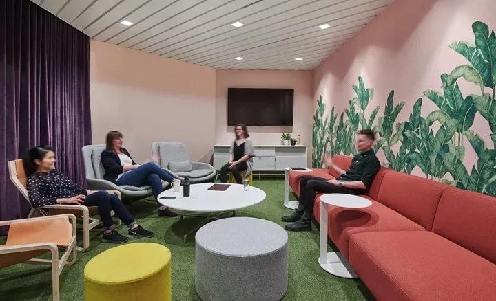 一間正式會(huì)議室,墻面鋪滿了綠色棕櫚葉墻紙,并配以綠色扶手軟椅,在綠色清新風(fēng)中,具有吸音性能的紫色布藝窗簾形成鮮明的色彩對(duì)比。毛氈聲學(xué)燈具BuzziPleat更是為整個(gè)空間錦上添花,帶來(lái)美美的視覺(jué)。