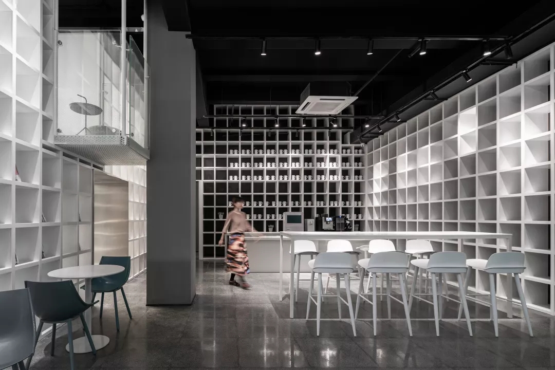 We make the reading room with Tiffany Blue as the core of the Female Box in response to the spiral staircase with Klein Blue at the entry, as well as the external kid’s area with bright yellow color at the back of the box.This community living room would be just a cliché and lose its function of demonstration if it was hidden inside of a commercial space. Youkong Living Room is more like an opening box on its façade. The four-meter high semi open entrance is made of perforated aluminum panels, which is a representational move of Wutopia Lab that from there you can see warm and gentle lightings, bright blue colors and kid‘s laughter.