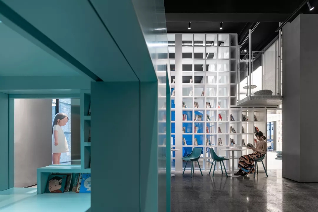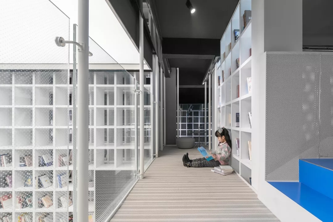 我用蒂芬妮藍閱讀屋作為女性盒子的中心,與此呼應的是入口可見的卡萊茵藍螺旋樓梯,以及盒子背面室外的明黃色兒童活動場地。他們精致地鑲嵌在有些迷離模糊的空間中成為點睛之筆。如果社區(qū)客廳藏在陳詞濫調(diào)的商業(yè)里面之后,就失去了示范作用。有空客廳的立面就是一個打開的盒子,高4米的半開門是穿孔鋁板制作的,形成了Wutopia Lab標志性的半透明界面。你能從這里隱隱約約的窺看到,溫暖的燈光,明亮的藍色,和孩子的笑聲。