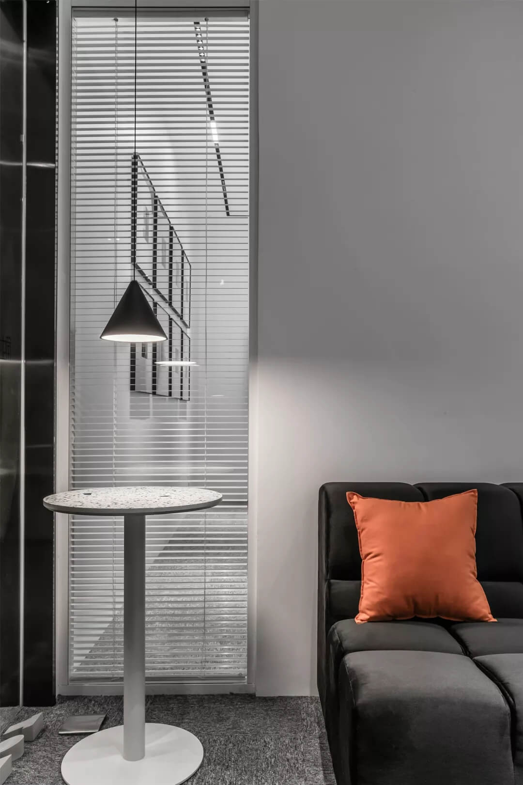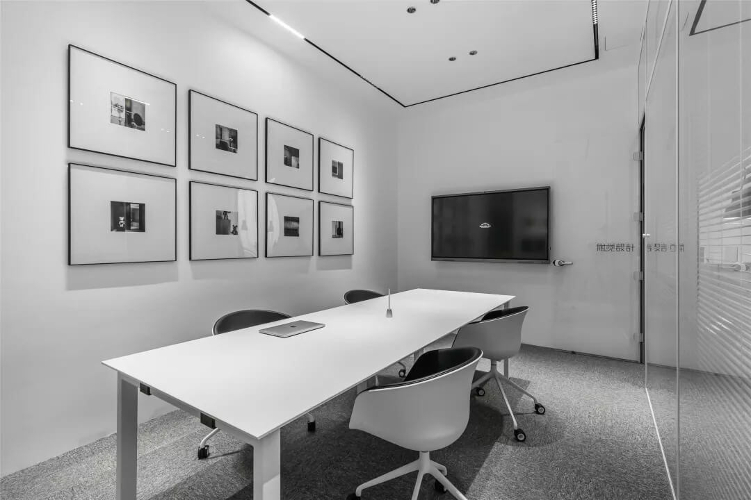為了同時保證隱私和透明,張馳有道。會議室采用了玻璃+百葉窗的設(shè)計,這樣的交流區(qū)域保持彼此的通透與聯(lián)接,提升了場所的張力。使用貼合設(shè)計的局部掛畫藝術(shù),配以金屬的深邃感官,多媒體影視裝置加強了墻面空間的信息輻射作用。