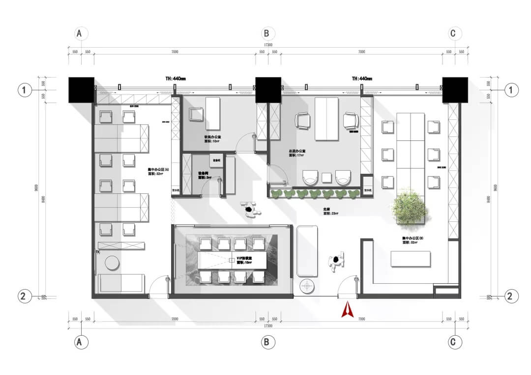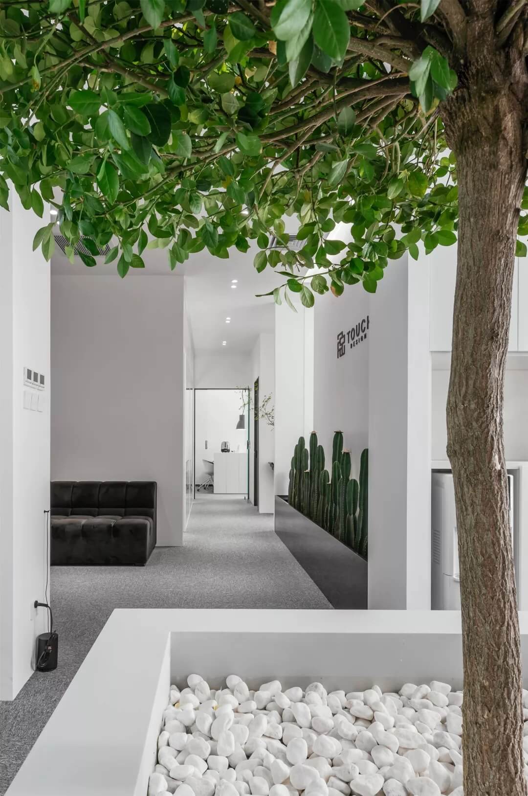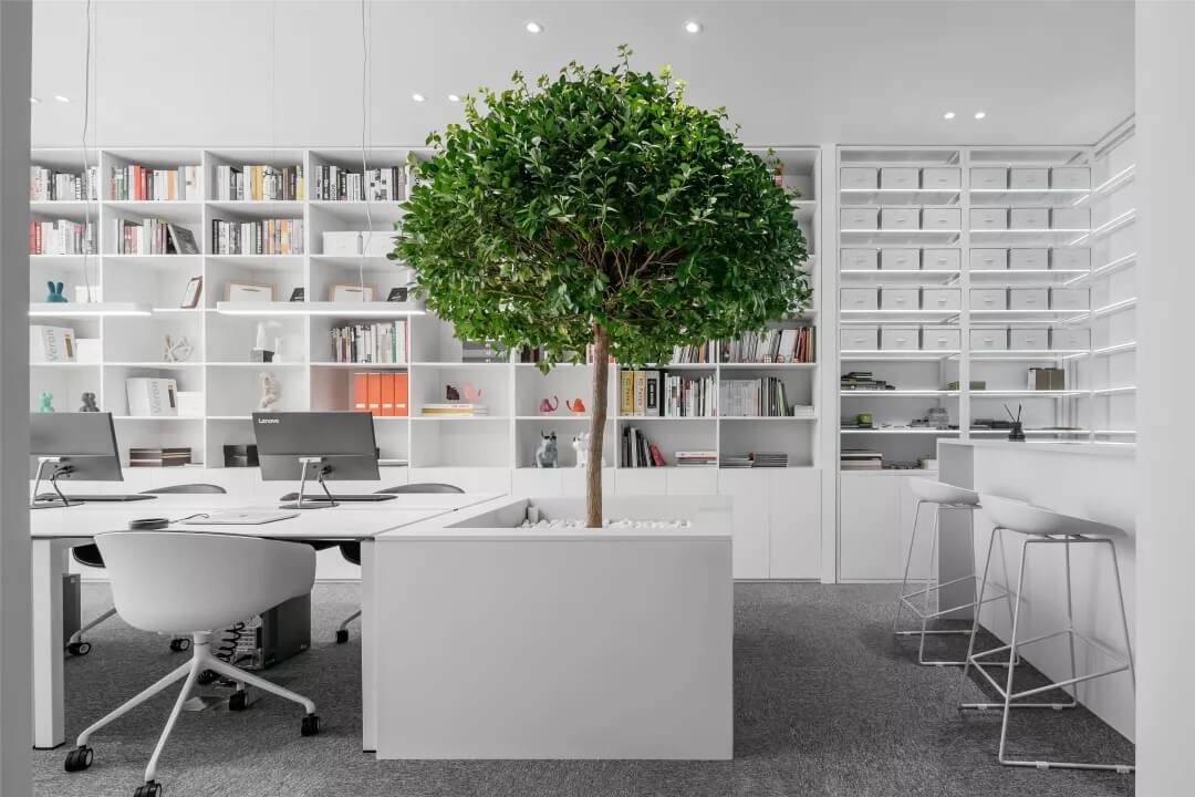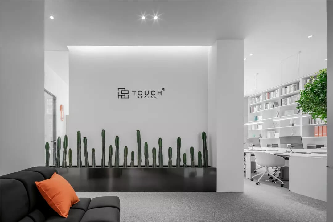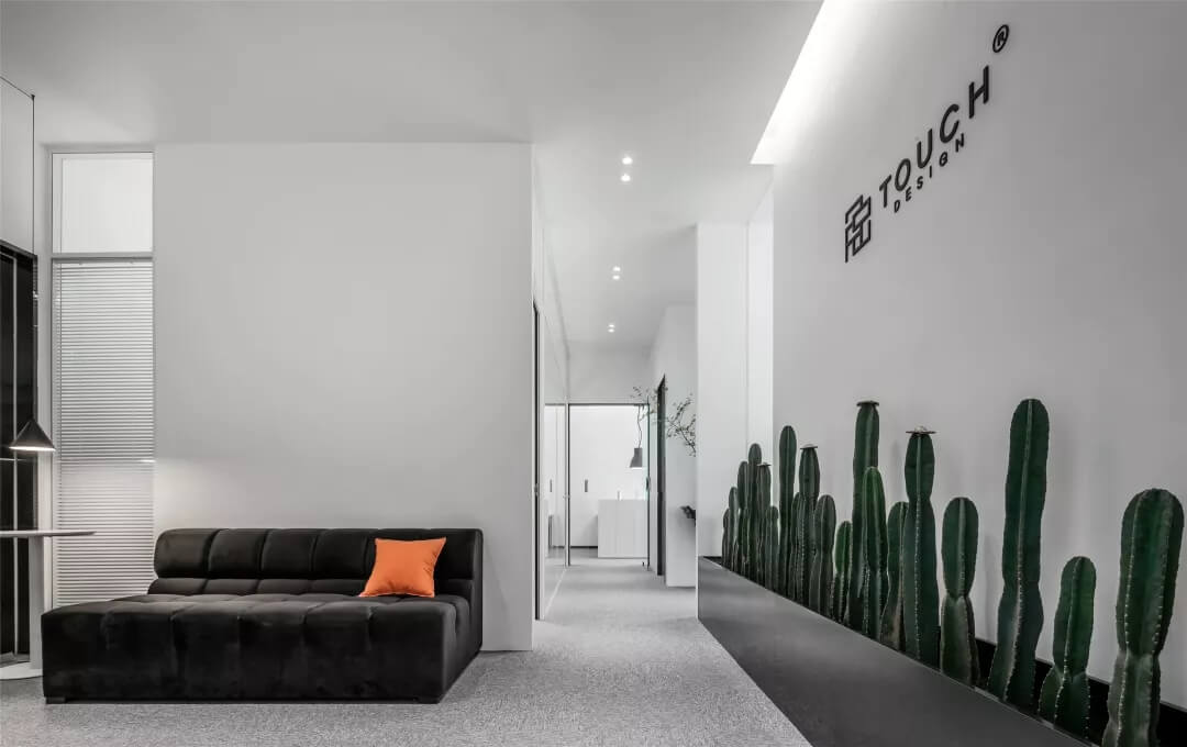 刪繁就簡,以最經(jīng)典的白色為主題搭配色調(diào),沒有繁瑣的辦公室設(shè)計和過多的裝飾,減去辦公中的壓抑感。通過將自然純凈的白色與沉靜黑色相結(jié)合,將品牌形象簡潔地呈現(xiàn)表達,同時為左右空間的過渡創(chuàng)建和諧觀感。純白的墻面,接近心靈的澄凈;仙人掌是視覺的焦點,恣意生長、堅韌、夯實根基,也正寓意著公司的設(shè)計理念:有所依、有所仗、有所長。