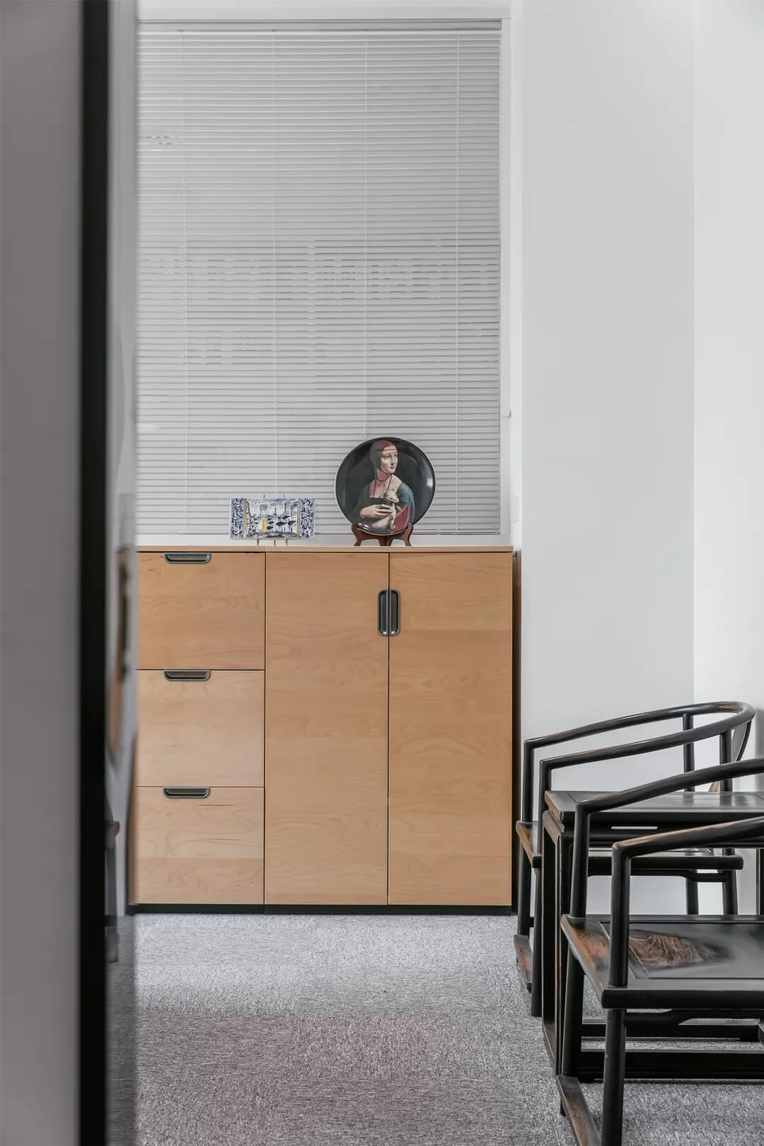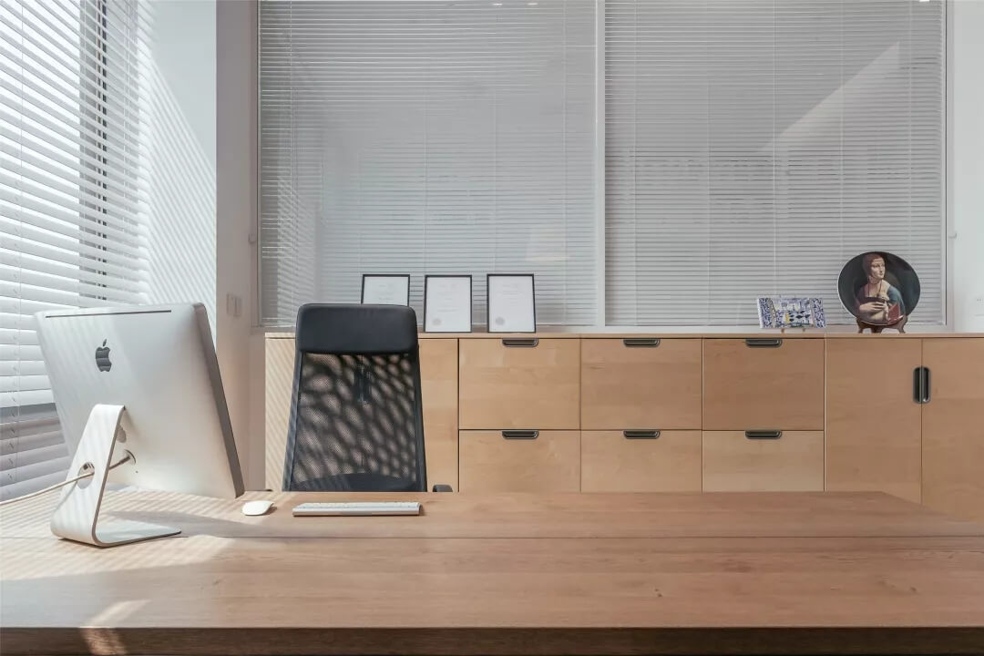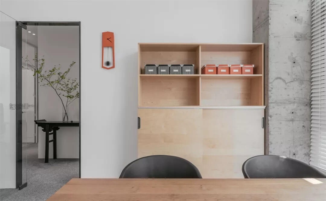自由無拘的溝通對于團隊的創(chuàng)新至關(guān)重要。開放的辦公區(qū)是有效獲取信息和激發(fā)靈感的地方。百葉窗折射的光影,充足的自然光營造高效的工作環(huán)境。空間雖然有限,但發(fā)揮最大的性能,開辟出一整面的軟裝材料搭配區(qū)。