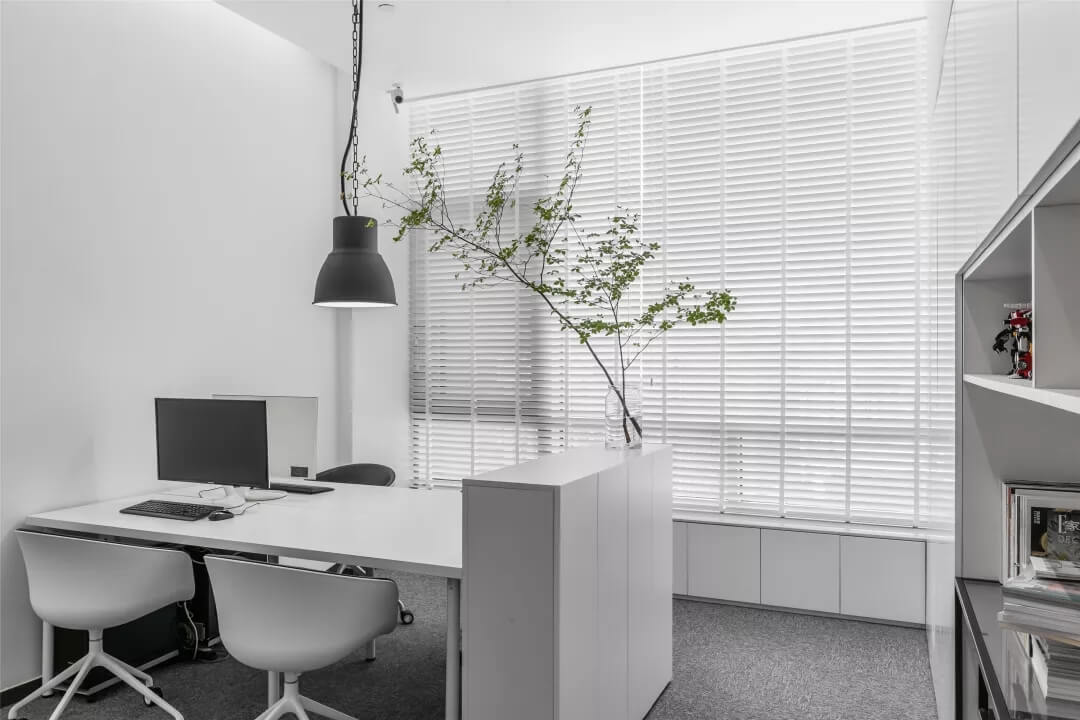 另一側(cè)的空間則增添了二三分私密性。沉穩(wěn)的木質(zhì)案桌上,擺放的綠枝椏仿若思想的觸手,與仙人掌、小株綠植串聯(lián)起空間動線。區(qū)域內(nèi)各自獨立,用玻璃門分隔開,在保證個人能最大限度沉浸思維創(chuàng)作的同時,又能及時地與伙伴交流互換,碰撞不同的思想。