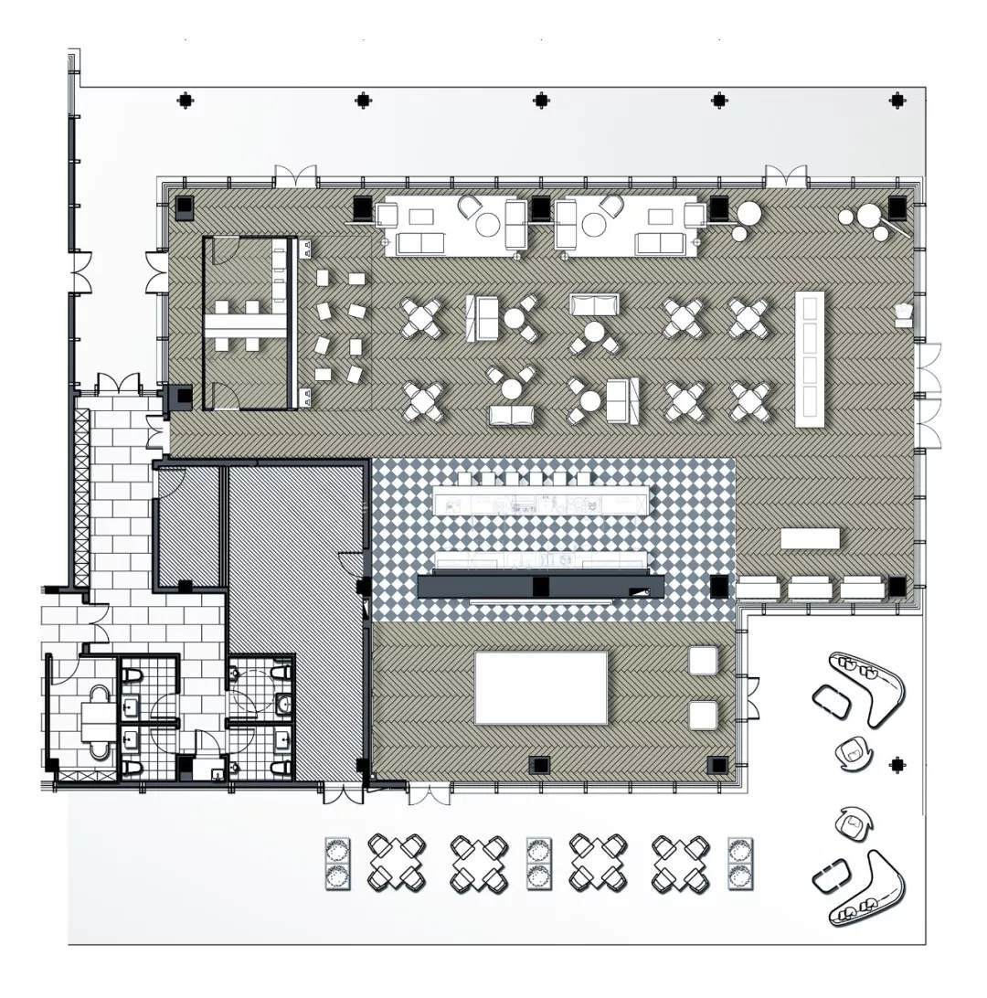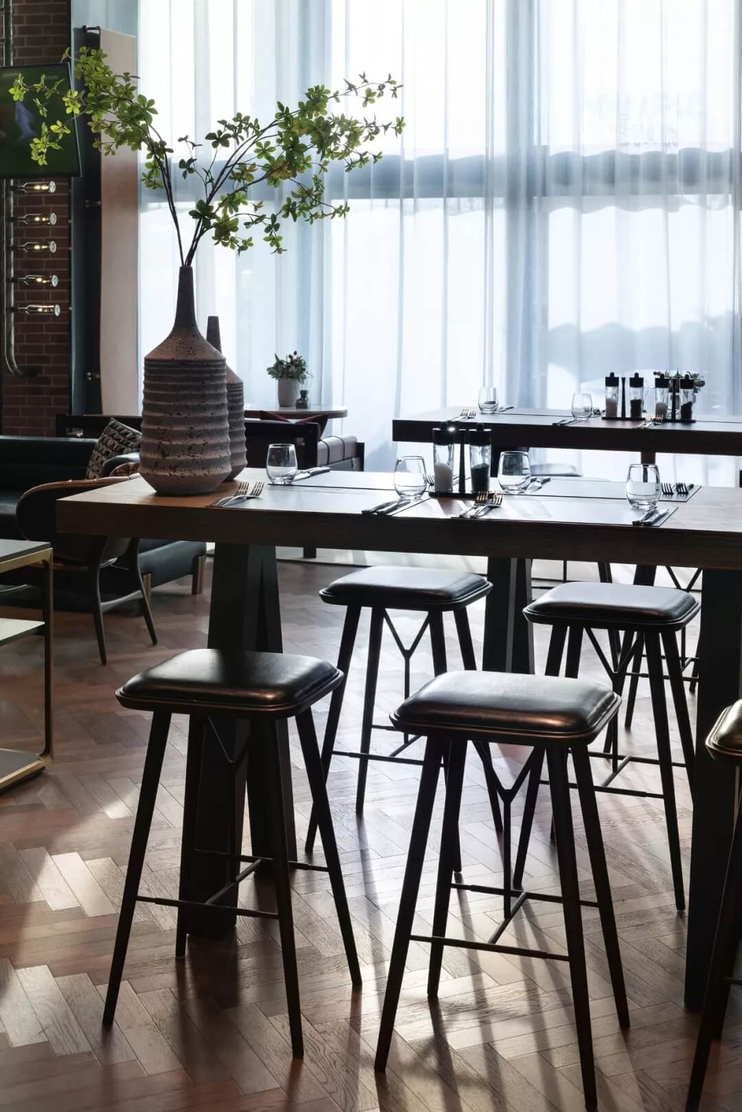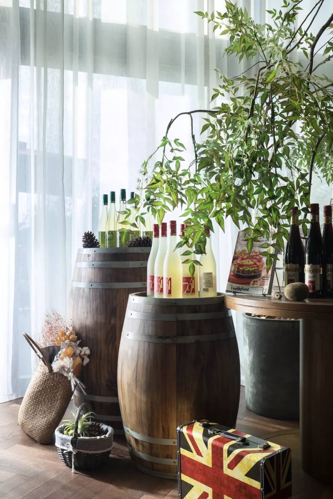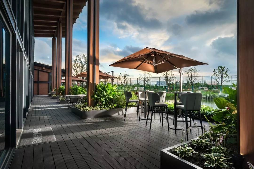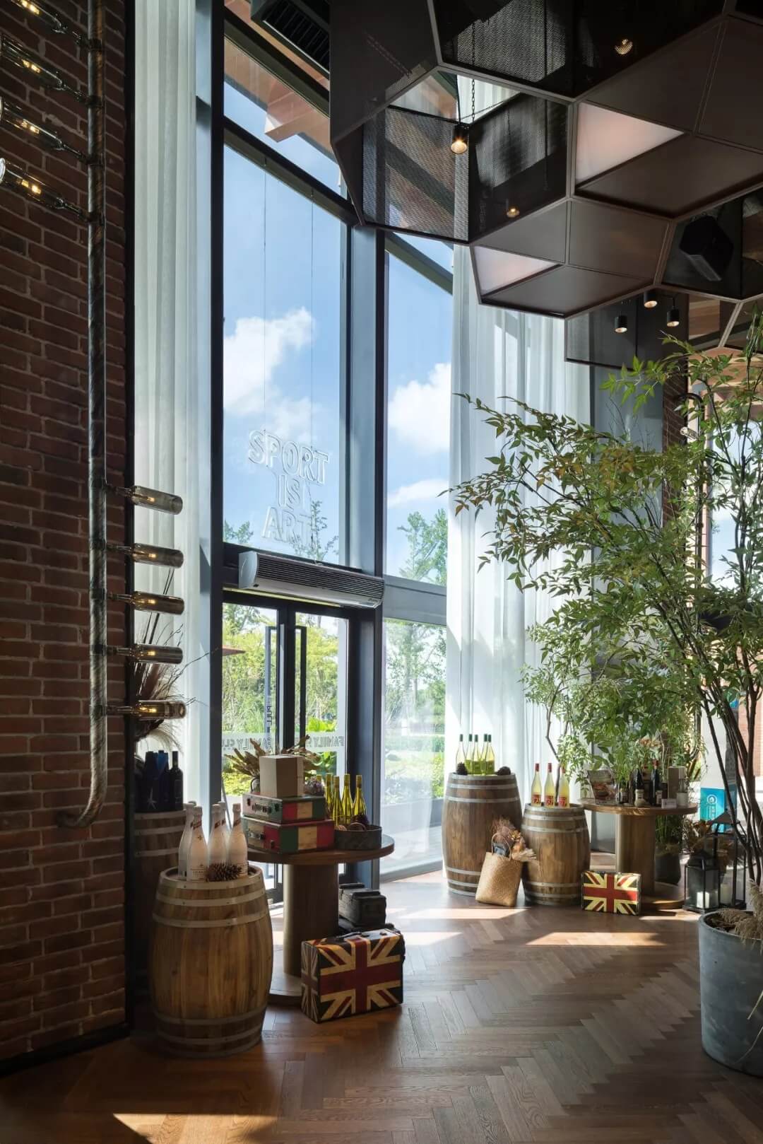 自然的青翠綠意與質(zhì)樸的啤酒桶木藝氣質(zhì)互融,靈韻交加,酒香沁人,不加過(guò)多修飾地圍合出一隅相對(duì)靜謐的臨窗休閑區(qū)。在這里,設(shè)計(jì)透過(guò)落地玻璃窗的相隔將內(nèi)外視域完全打開(kāi),陽(yáng)光傾灑進(jìn)來(lái),引入截然不同的清新與濃密的自然舒適度,外在景觀與內(nèi)在布設(shè)氣質(zhì)相合。