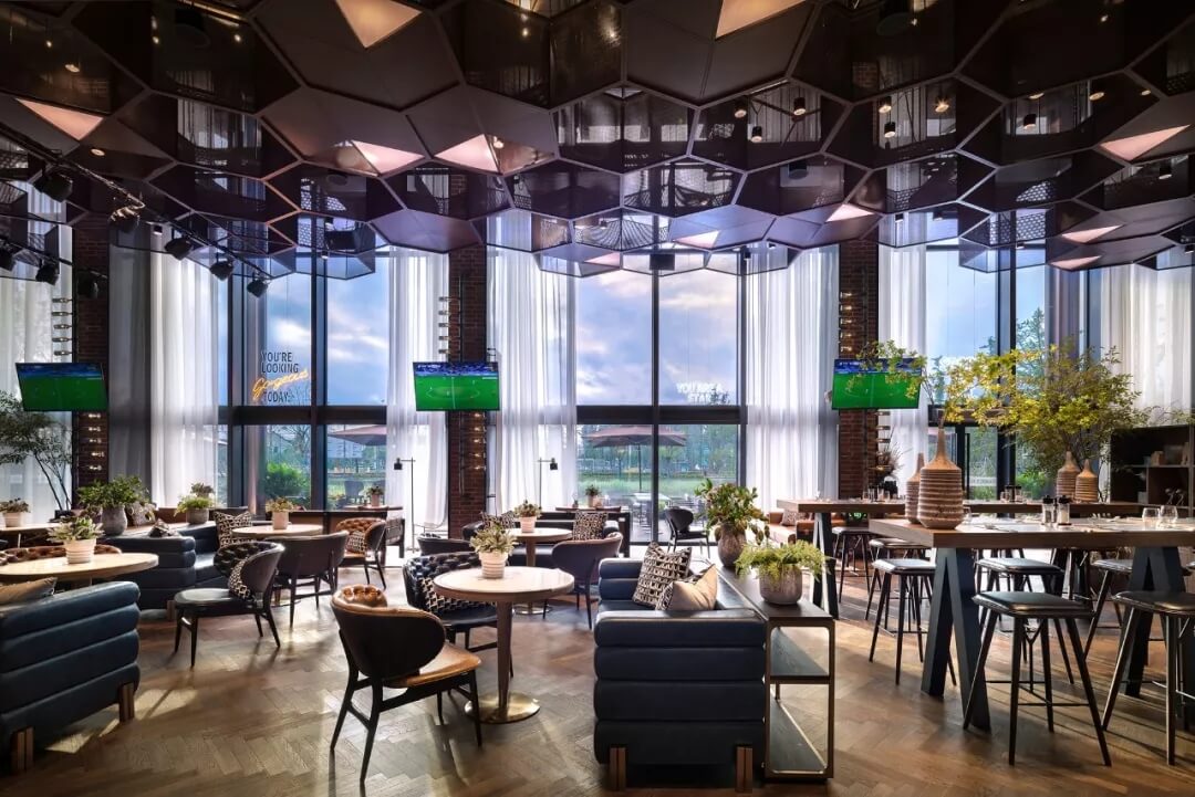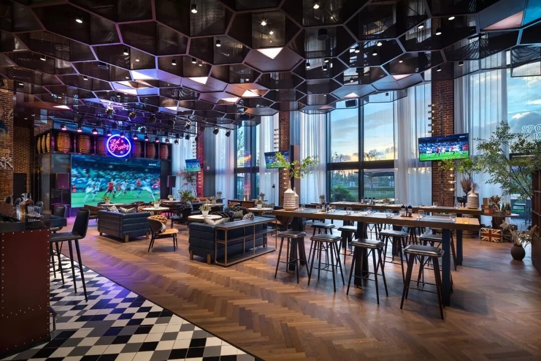 設(shè)計(jì)將足球的六邊形化用于天花的裝飾上,立體幾何的體量、金屬線條的質(zhì)感賦予了社交空間的適當(dāng)距離感。多幅大屏幕的配置,讓聚于此的人們,沉浸于啤酒吧和比賽現(xiàn)場(chǎng)的氛圍當(dāng)中,盡情享受在開(kāi)闊大氣的空間格局中觀摩賽事的自由,為熱愛(ài)喝彩,為夢(mèng)想干杯,傳遞運(yùn)動(dòng)不止的精神。