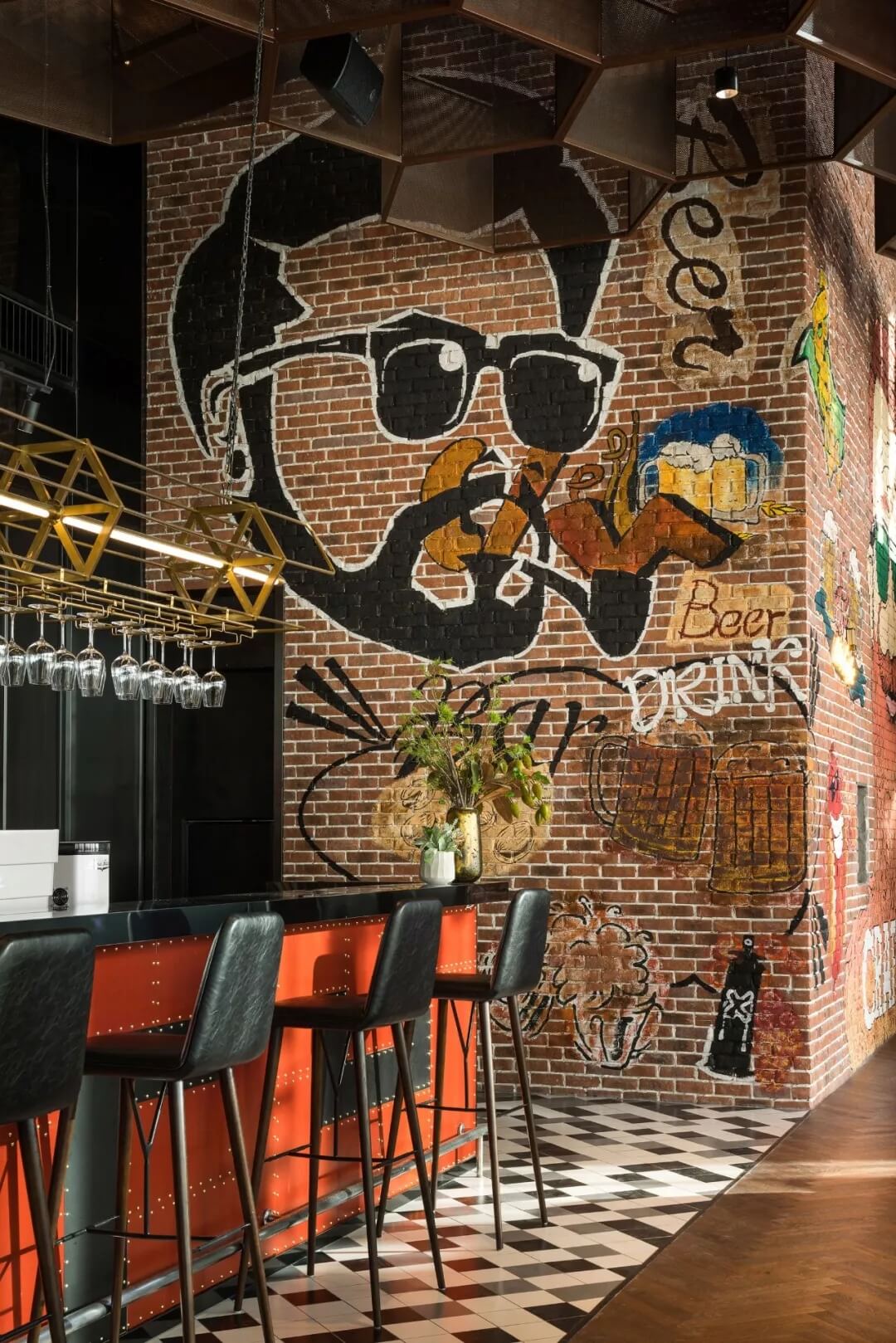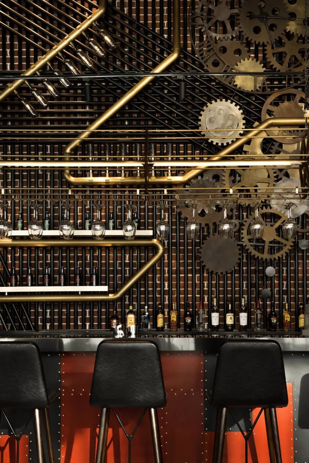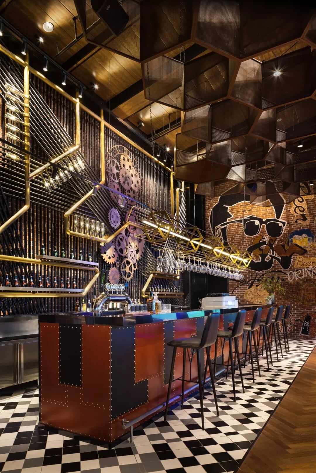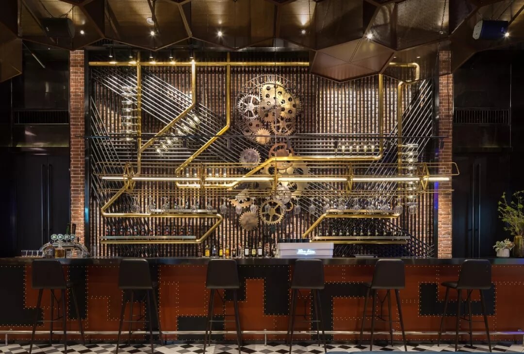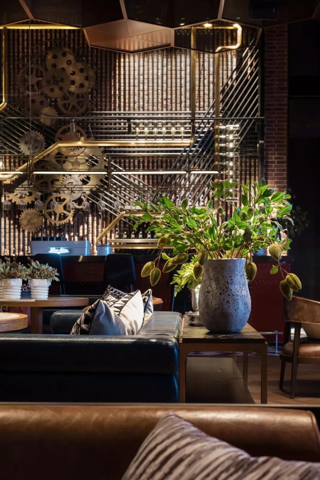工業(yè)風(fēng)的精髓在于,在原空間樸拙素簡(jiǎn)的本真狀態(tài)下延展其自由隨性的氣質(zhì),在粗獷的空間架構(gòu)中消解拘束感,呈現(xiàn)出大氣又不失細(xì)膩的美感。粗礪的紅磚墻、朋克夸張的墻畫(huà)涂鴉、裸露的管道線路、復(fù)古做舊的齒輪掛件、紅黑交接的鉚釘吧臺(tái)......統(tǒng)攝進(jìn)工業(yè)風(fēng)的設(shè)計(jì)常規(guī)之中。