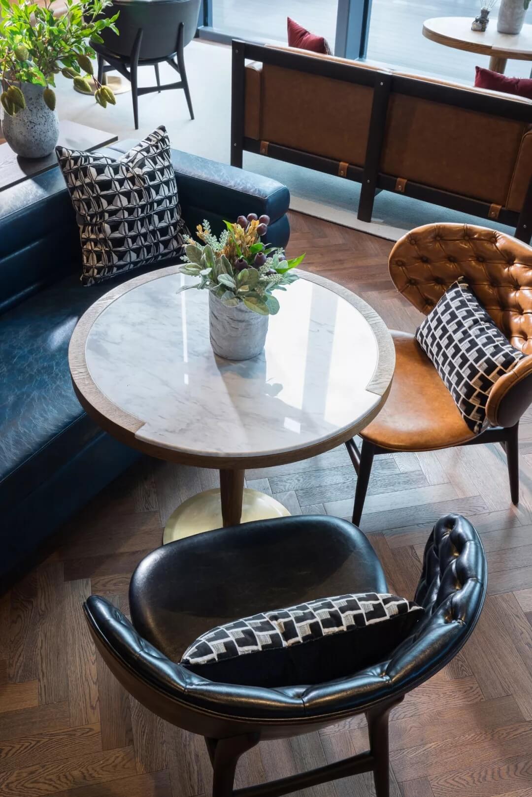 設(shè)計(jì)運(yùn)用極簡(jiǎn)的語(yǔ)言,打開(kāi)空間與自然的悄聲對(duì)話,咖色的皮質(zhì)沙發(fā)、幾處花藝、數(shù)個(gè)土陶裝飾,充盈著活力與生氣,人們置身此處,身心分外舒愜。