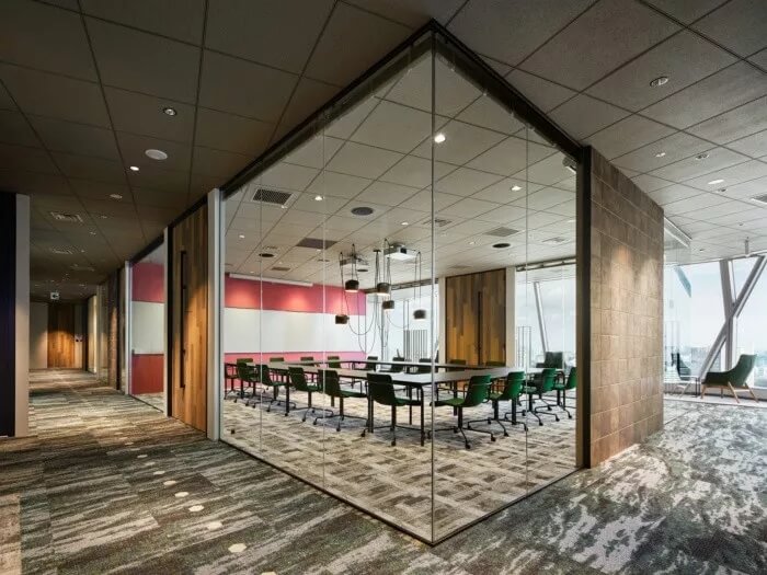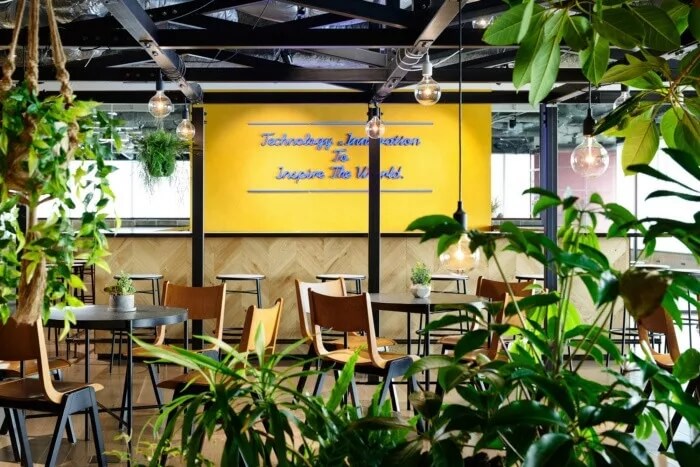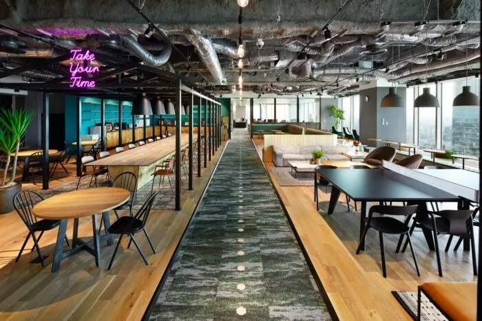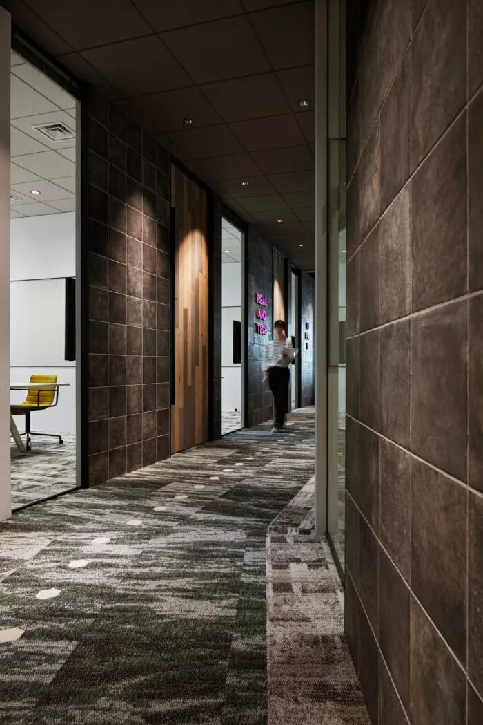 為此,設計團隊的目標是讓辦公室成為一個人們隨便可以咨詢房地產相關資訊的地方。入口處有許多綠植,寬敞的空間看起來比起居室還要舒服。辦公室配備了帶有防污圖案的框架,復古吊燈和帶有當下流行風格的霓虹燈標注,徹底改變房地產公司的傳統(tǒng)形象??臻g約有3300平方米,擁有20多件會議室,員工使用的公共空間介于工程師和代理商空曠的工作間之間。