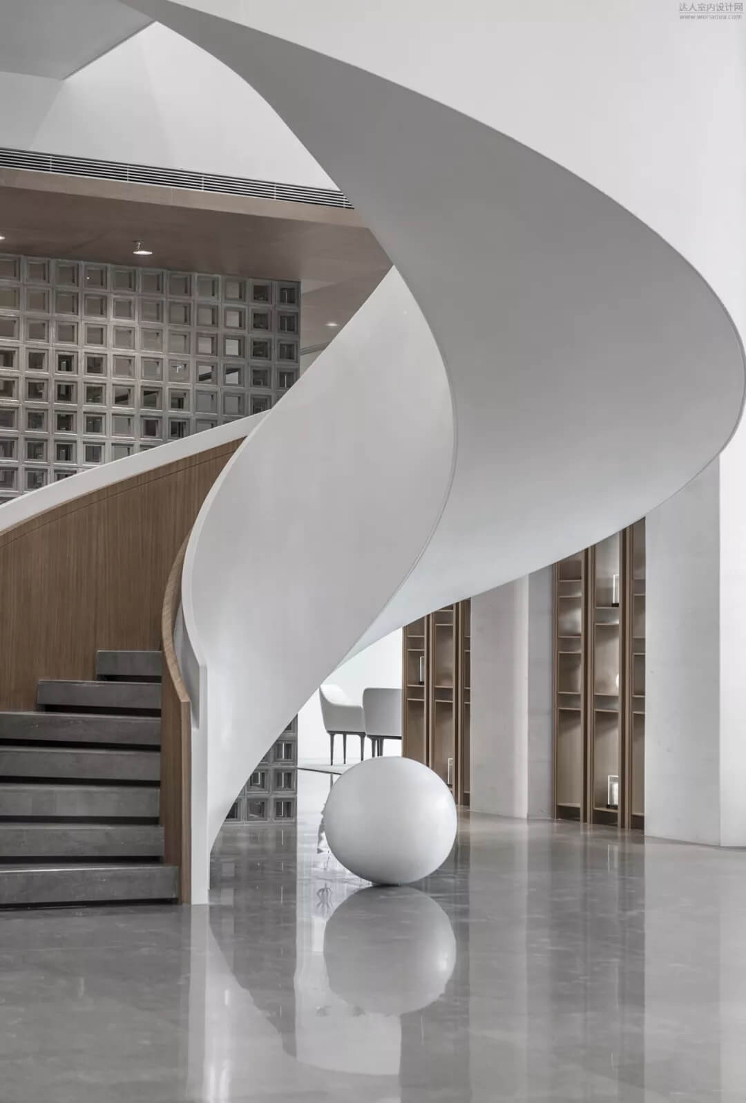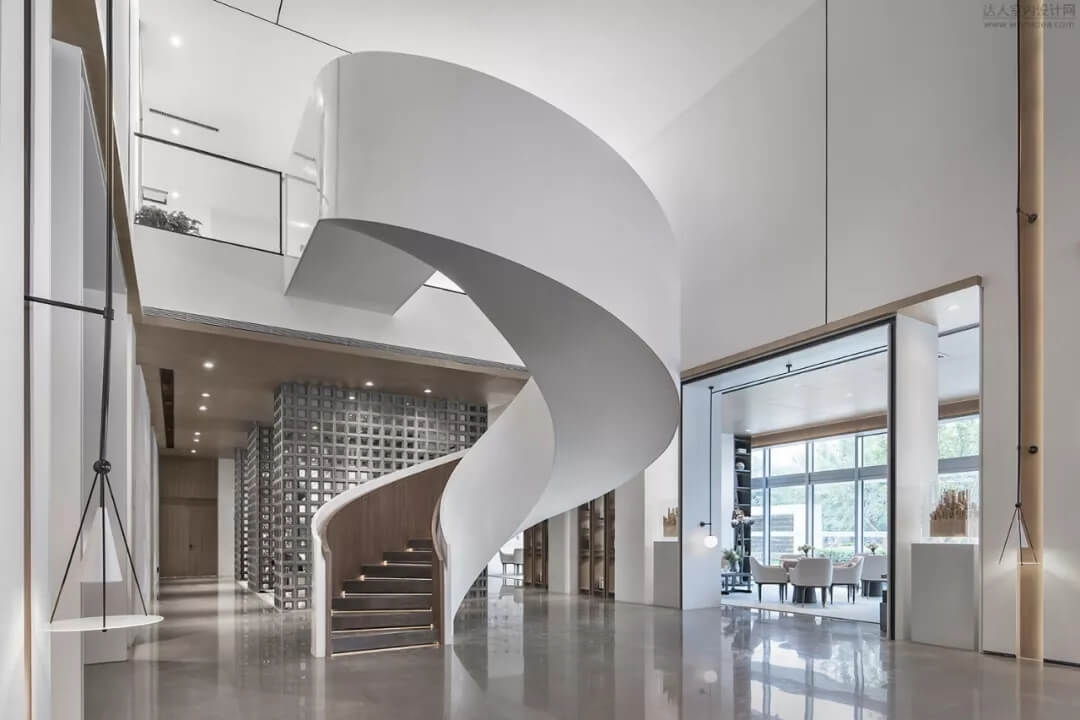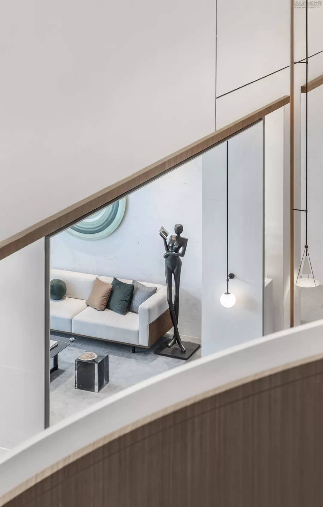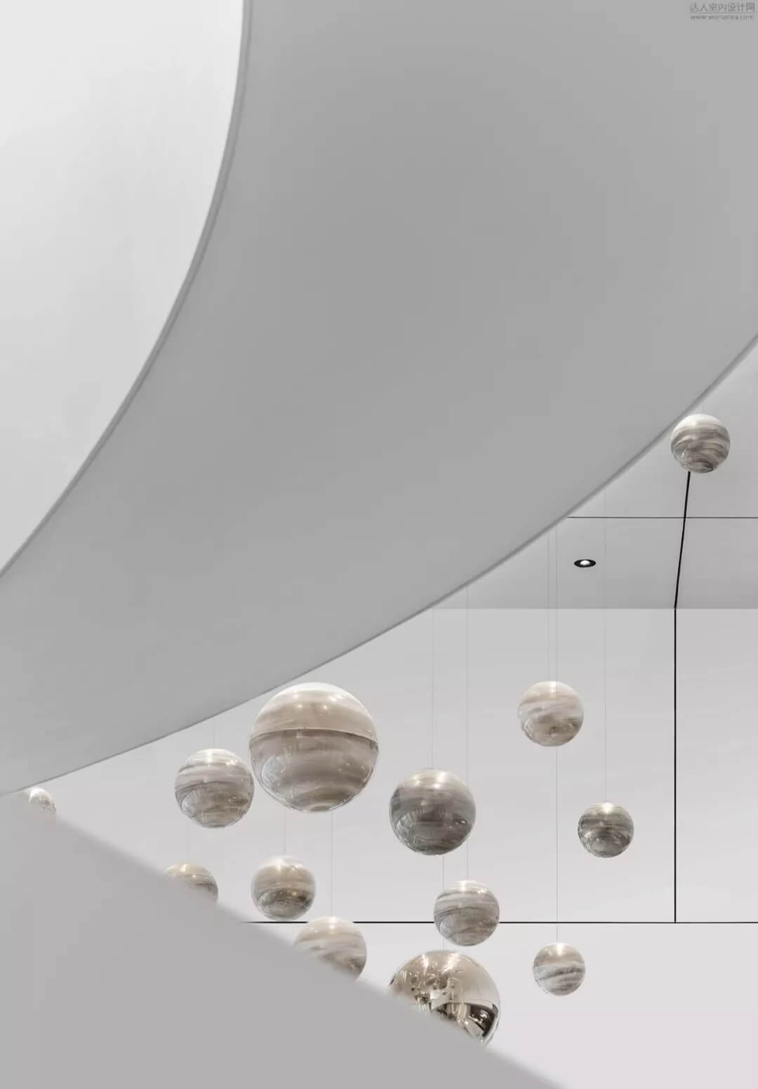 淡雅的白色配以溫馨木色的夢幻般旋轉樓梯入口,白色球體與之呼應,旋轉而上,動態(tài)感的景色盡收眼底,格子狀猶如延續(xù)的·星際穿越,感受平衡時空不同維度的交措時光,身處'空間',在無限與有限中穿梭,不經意的轉角余光是同色的球燈相映,優(yōu)秀的設計師是會講故事的人。