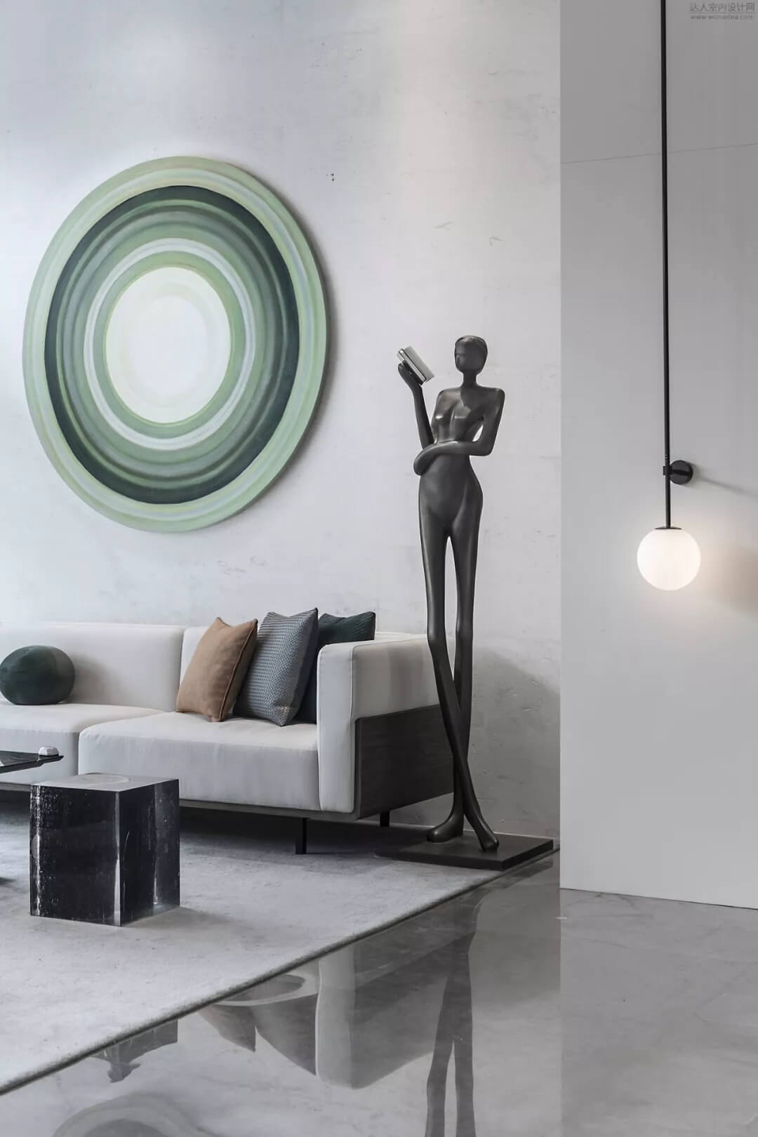 文明的前行離不開知識的積累,時間的沉淀會給人類提供更多的寶貴經驗,有心的設計靜立與整個空間,凝結的時間之輪·以樹木年輪為靈感是此處洽談區(qū)的特色,手拿書籍的雕塑予以智慧的氣息的重要性。
