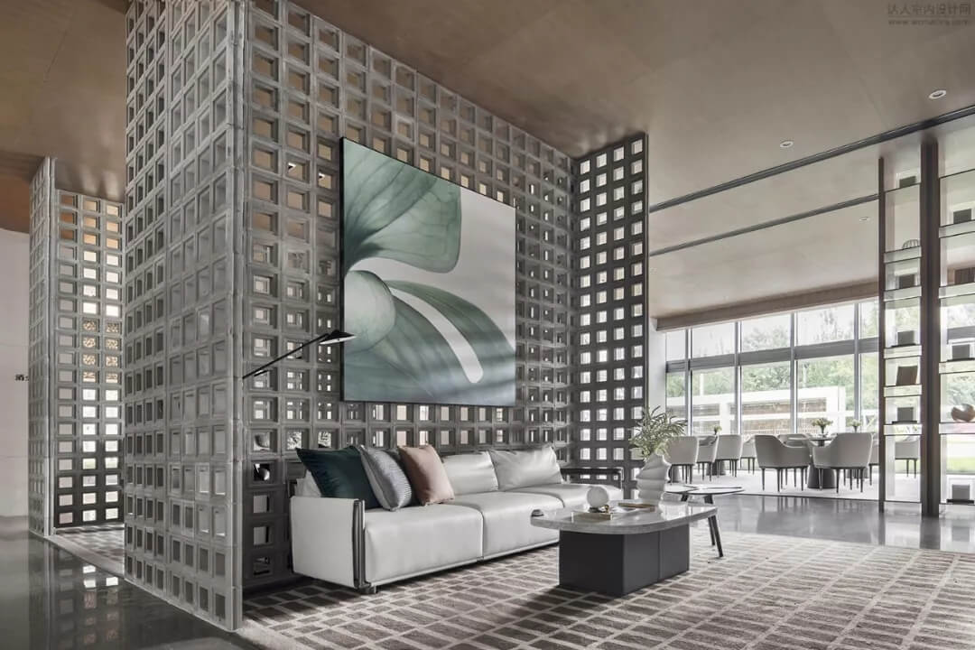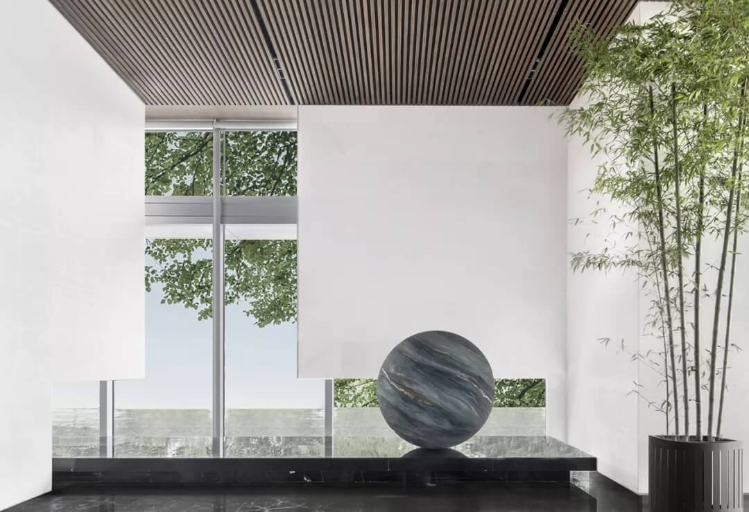進入前廳,暗涌波動的猶如海洋的紋理型球狀醒目與空間,設計師賦予的撞色又猶如浩瀚星空。以玻璃與室外的相隔,營造視覺的感覺錯覺,仿若一體的空間綿延。