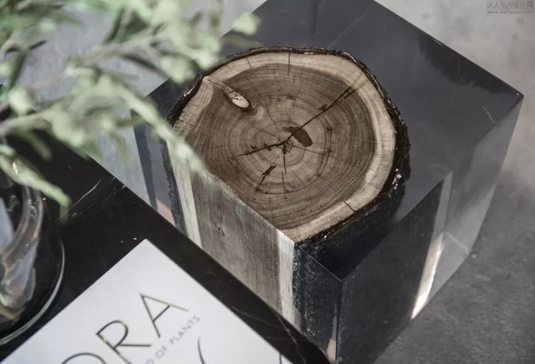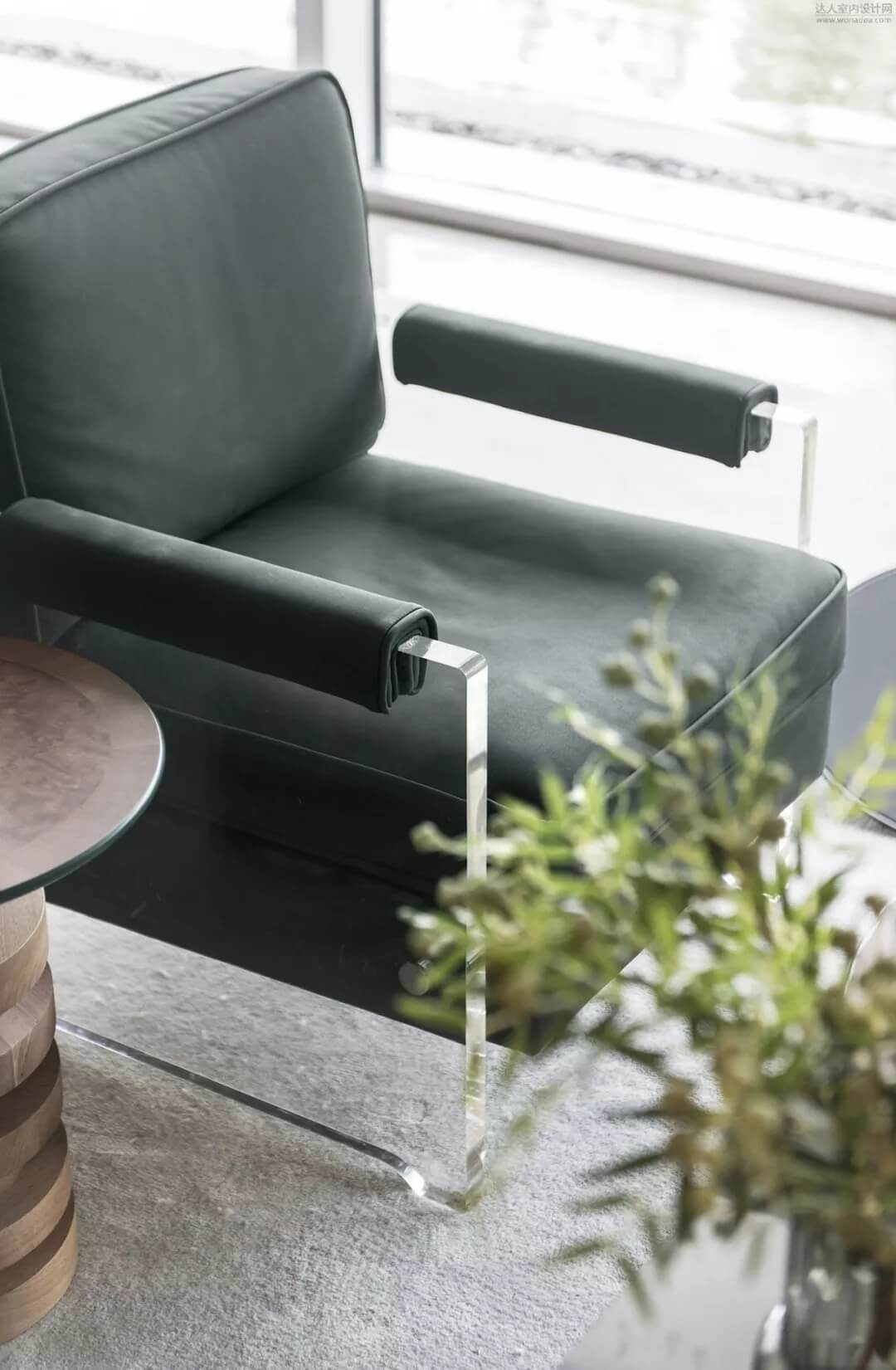 尊重木質的肌理美感,熟諳工藝,亞克力材質包裹的木質年輪,如同凍結了時間的流逝,守住這一刻的永恒。簡潔的質感綠色皮質沙發(fā)予以低調的奢華,同色系的植被增加了空間層次感。