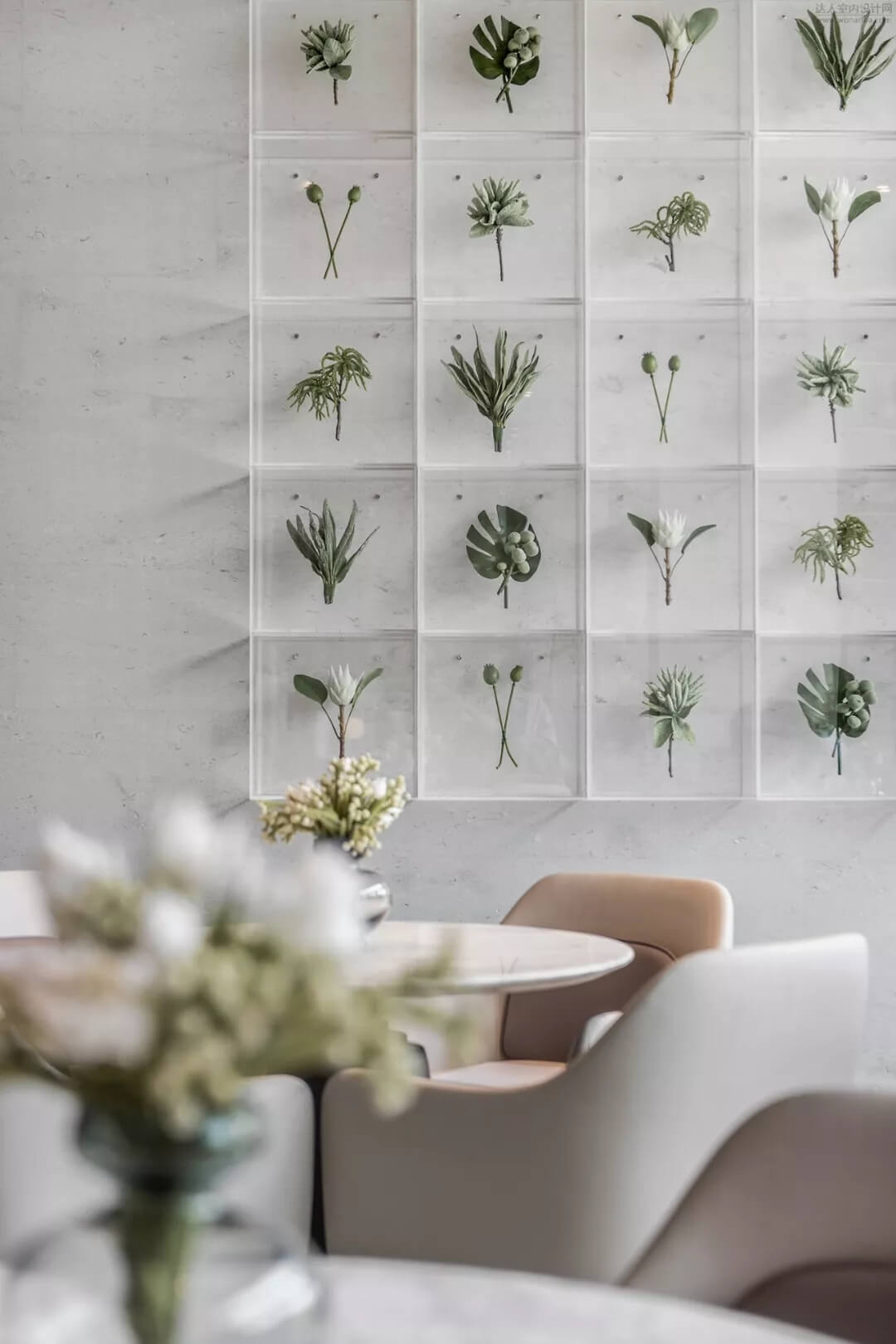 洽談區(qū)的一面墻壁,猶如進入了植物博物館,自然果實鑲嵌與其中,綠色是植被的主色,也是和平的代表,也是予以生命呼吸之本源,每個小小的果殼中都孕育著無限大的能量。