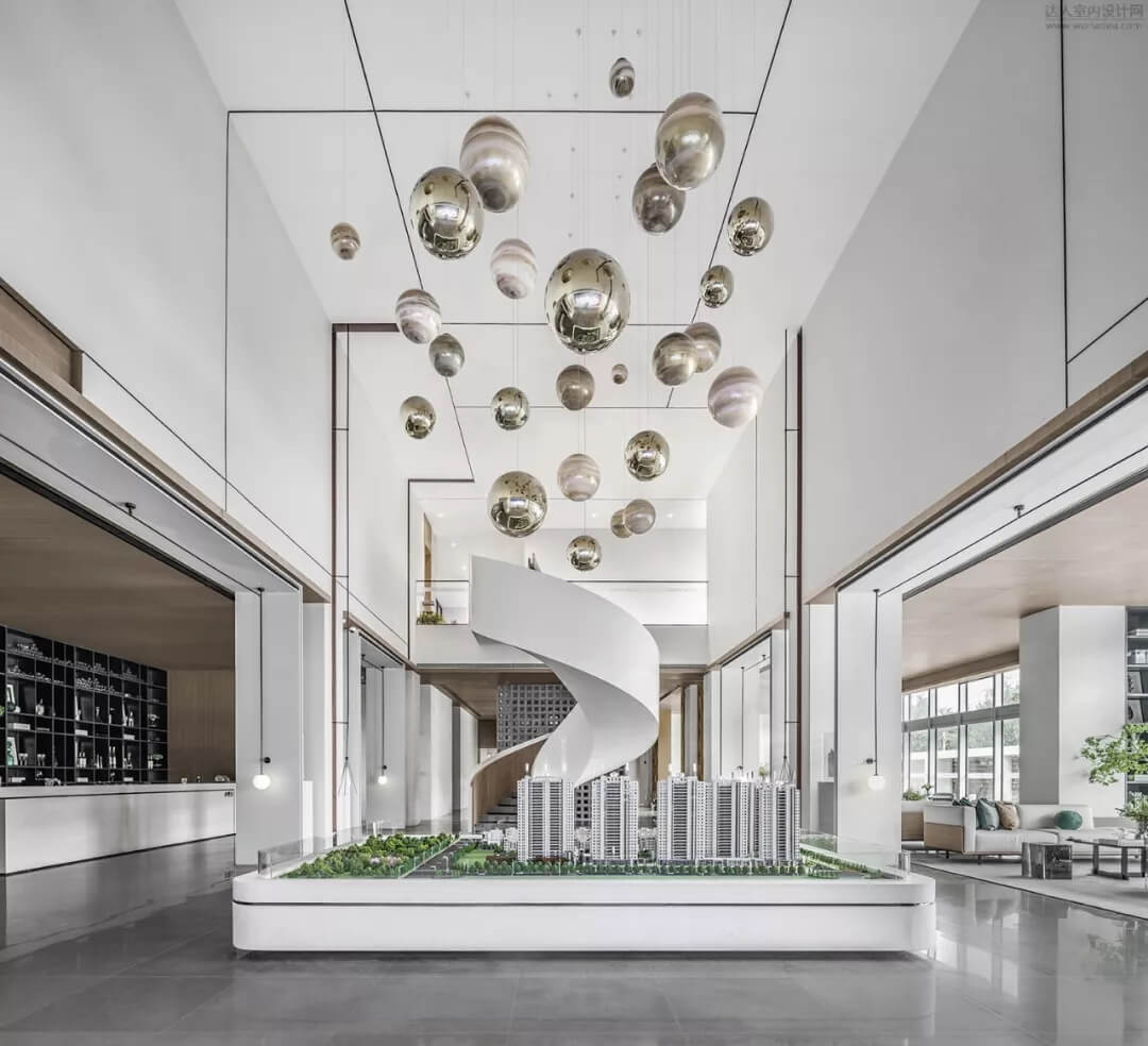 以和諧地球為理念展開的設計元素,售樓處上方錯落有致、大小不同的球體精致的點綴著空間,紋理折射光線,以靜止狀態(tài)演繹動態(tài)。