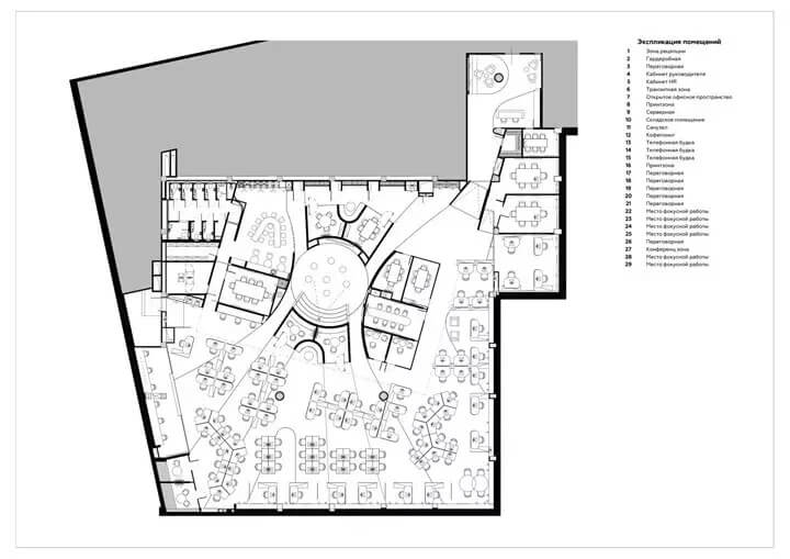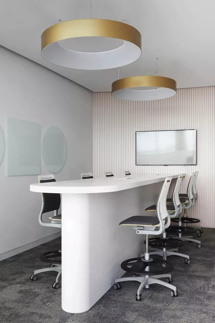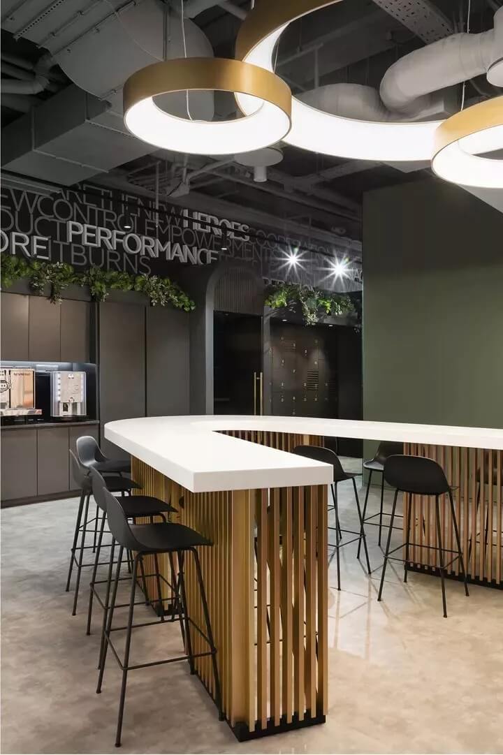 計(jì)概念的靈感來(lái)源于公司的名稱——L'or(法語(yǔ),意為gold金色)和aurele(法語(yǔ),意為halo光環(huán))。“金色光環(huán)”的品牌寓意成為整個(gè)空間形式的構(gòu)造背景,整個(gè)辦公室的主動(dòng)線也圍繞著一個(gè)圓環(huán)來(lái)規(guī)劃。這個(gè)中心圓環(huán)被定義為一個(gè)明亮的核心空間,形成一個(gè)中心會(huì)議大廳,周邊分布著或開(kāi)放或封閉的會(huì)議區(qū)。