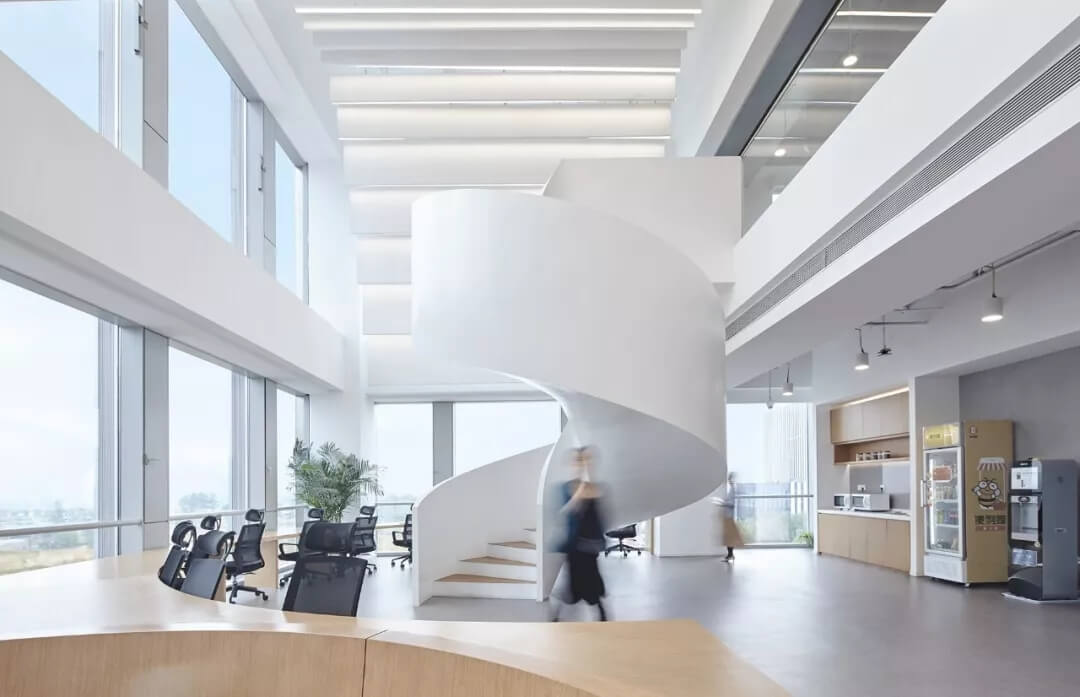 都市客廳島,選擇流暢線條的螺旋樓梯貫穿上下,運(yùn)用條形面板錯(cuò)縫排列成弧形的照明方式,使整個(gè)空間照度均勻,且條形面板亦可作為裝飾展示面。家居軟裝選用極簡(jiǎn)風(fēng)格,流線組擺方式,營(yíng)造自由靈活的空間,促進(jìn)員工間的交流和溝通。