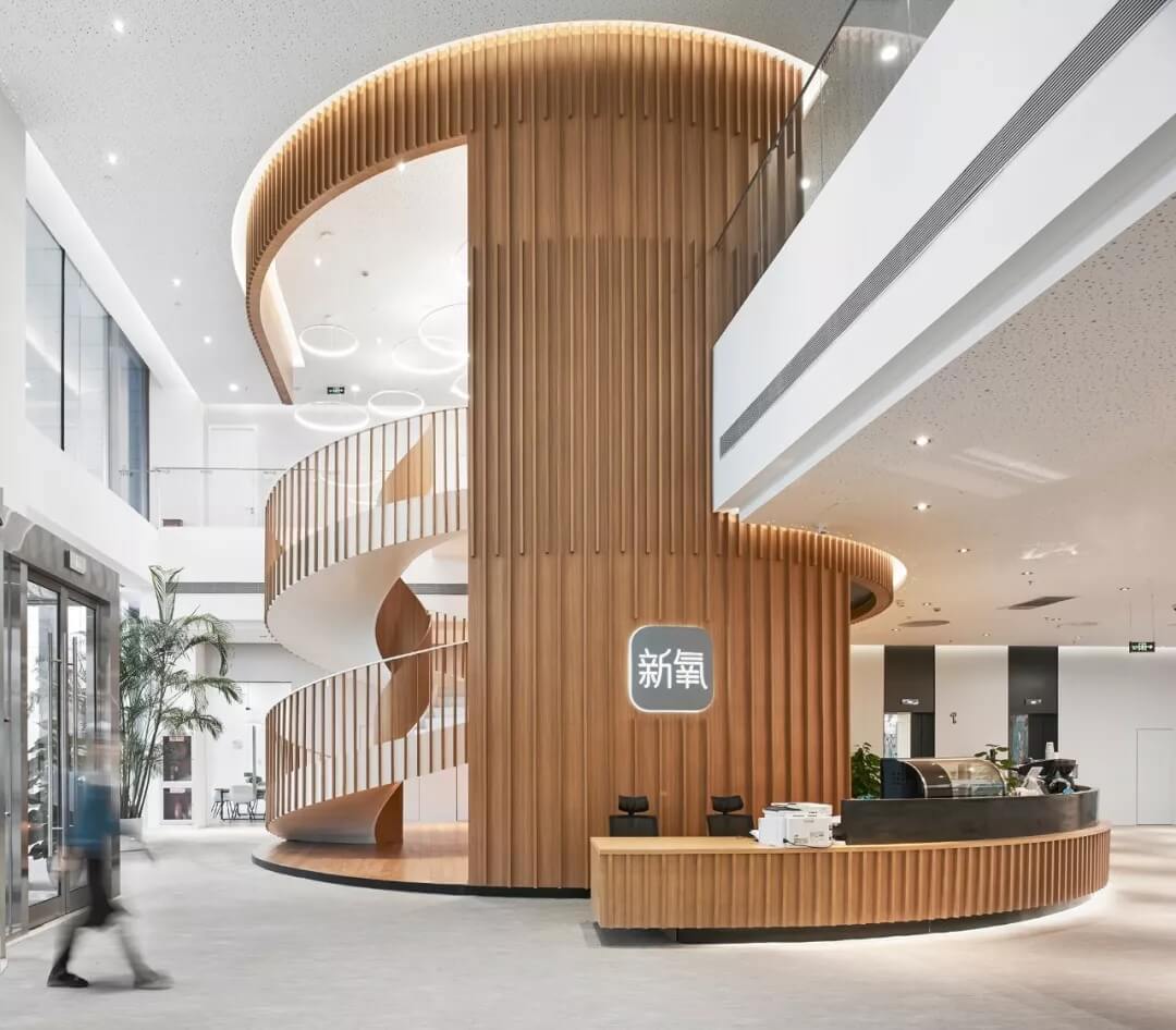 美麗生活館中最矚目的是兩個(gè)圓柱體空間模塊,一個(gè)是貫穿1-2層的木格柵旋轉(zhuǎn)樓梯,半開(kāi)半包,與咖啡館及接待臺(tái)合嵌為一體,溫馨,時(shí)尚,樓梯的內(nèi)側(cè)展示新氧的榮譽(yù)勛章;一個(gè)是透明的柱狀空間,以靜態(tài)裝置的方式展示新氧文化,周?chē)贾们⒄劷涣髯?;大堂南?cè)用文化墻隔出開(kāi)放的休閑洽談區(qū)和面試及收發(fā)室的圍合空間。