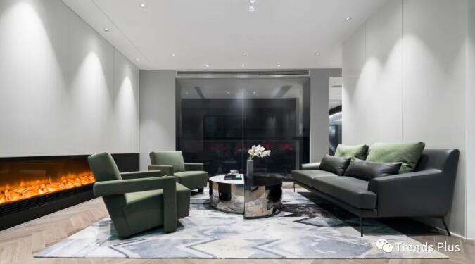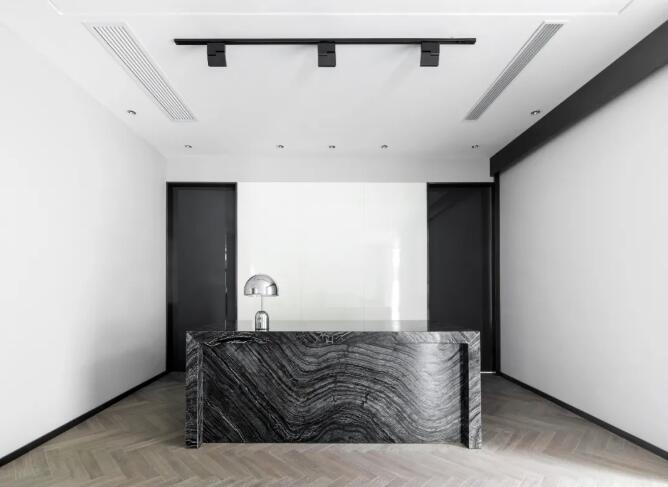 翡翠林梢青黛山,碧紗窗外水挪藍(lán),淺色的空間融入灰綠色的軟裝,建筑與室內(nèi)的氣質(zhì)彌漫開來。定制的麂皮絨沙發(fā),鏡面金屬和白色石材拼接而成的茶幾,藝術(shù)感彰顯無遺。黑色漸變玻璃隔墻,既是背景墻又是空間顏色最深的立面,讓茶水間在保持通透的同時(shí)又保證會客區(qū)客人的私密性。壁爐,火焰,回歸自然的同時(shí)讓氛圍變得輕緩,香茗與咖啡,讓辦公空間散發(fā)著靈魂的香氣。