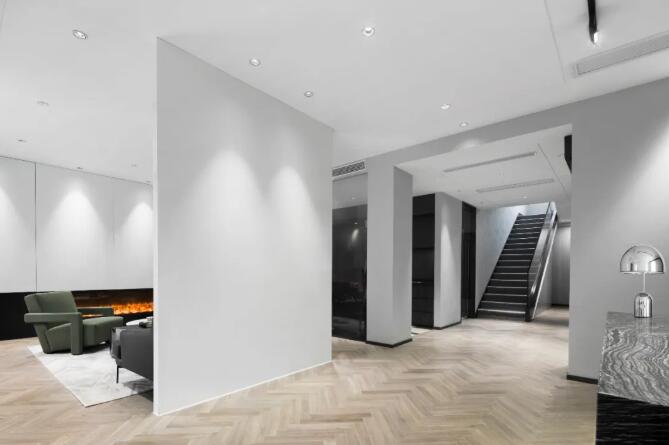 深色接待臺在白色的背景下顯得尤為安靜端莊。透過隔墻映入眼簾是會客區(qū)的壁爐一角、茶水間及小會議室。大面積白色混油木飾面讓空間擁有獨(dú)特的高貴氣質(zhì),突顯出集團(tuán)年輕、激進(jìn)向上的愿景。