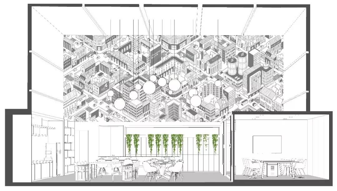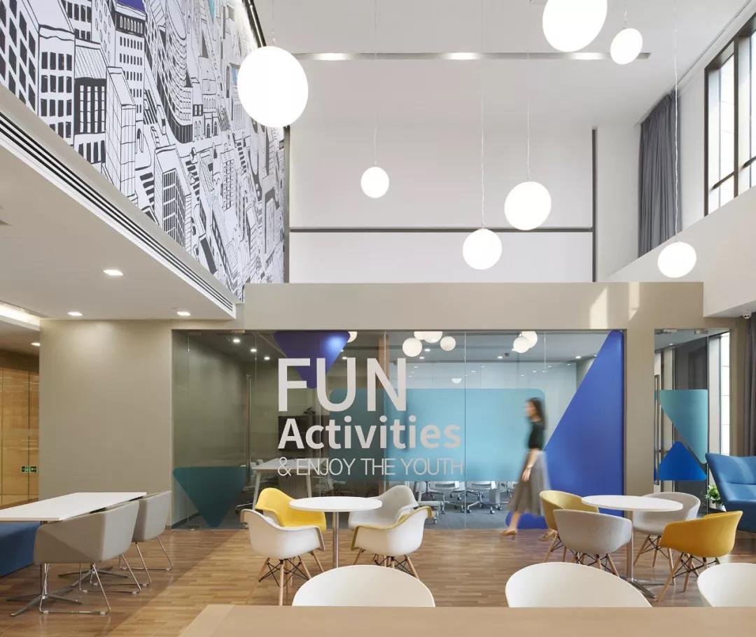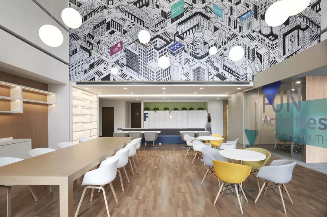 南側(cè)挑高區(qū)的空間定義為“城市客廳”,視覺感受區(qū)別于北區(qū)的咖啡主題,更加明快現(xiàn)代,為整個(gè)辦公區(qū)帶來(lái)時(shí)尚、活躍、靈動(dòng)的感受。“活力城市”的軸側(cè)插畫裝點(diǎn)了整個(gè)挑高區(qū)二層墻面,龍湖重點(diǎn)產(chǎn)品的標(biāo)識(shí)隱含其中,傳達(dá)出龍湖精彩紛呈的產(chǎn)品類型和高品質(zhì)特征。