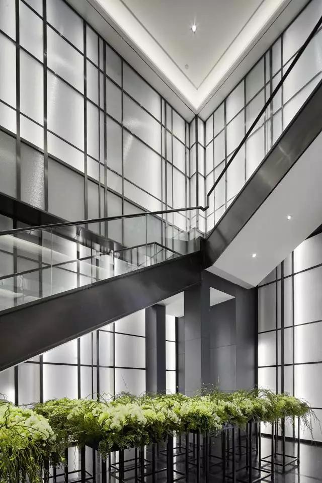 樓梯墻面引入“光線”的概念,設(shè)計(jì)上以簡潔的橫豎向線條元素構(gòu)成,結(jié)合原建筑結(jié)構(gòu),充分發(fā)掘空間內(nèi)的建筑感。