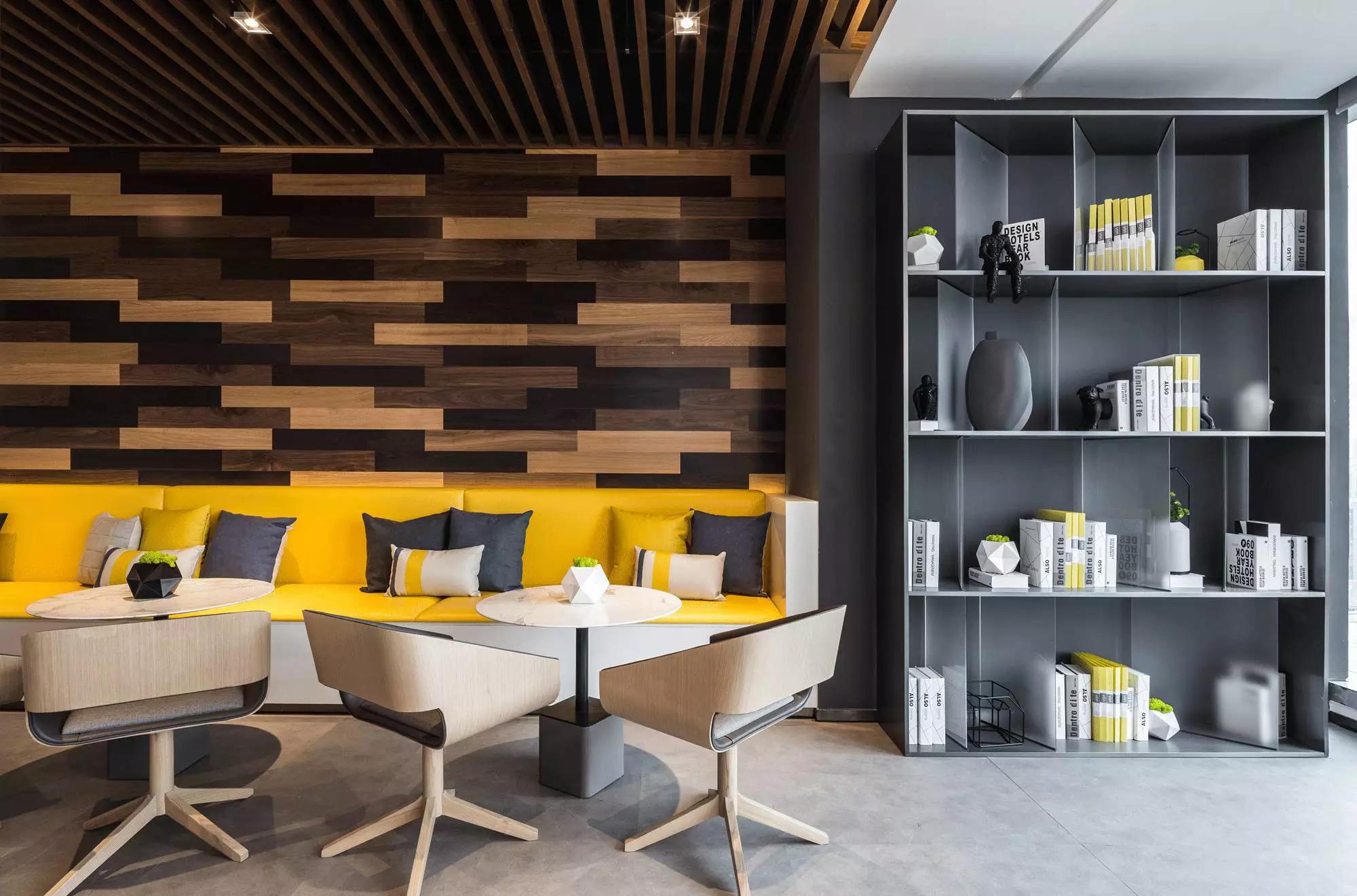 設(shè)計(jì)師用藍(lán)與灰搭配出冷靜主色調(diào),綴以沙發(fā)的暖意來(lái)提亮空間,而背景以深淺原木交錯(cuò)搭配,設(shè)計(jì)流于細(xì)節(jié)之中。閑時(shí),或仰臥在沙發(fā)上、在其旁邊的書(shū)柜看一會(huì)兒閑書(shū),或坐在沙發(fā)上與同事聊聊天、聽(tīng)一段舒緩的音樂(lè)、下一盤(pán)棋,小憩之后再投入工作,想必效率也會(huì)更高。