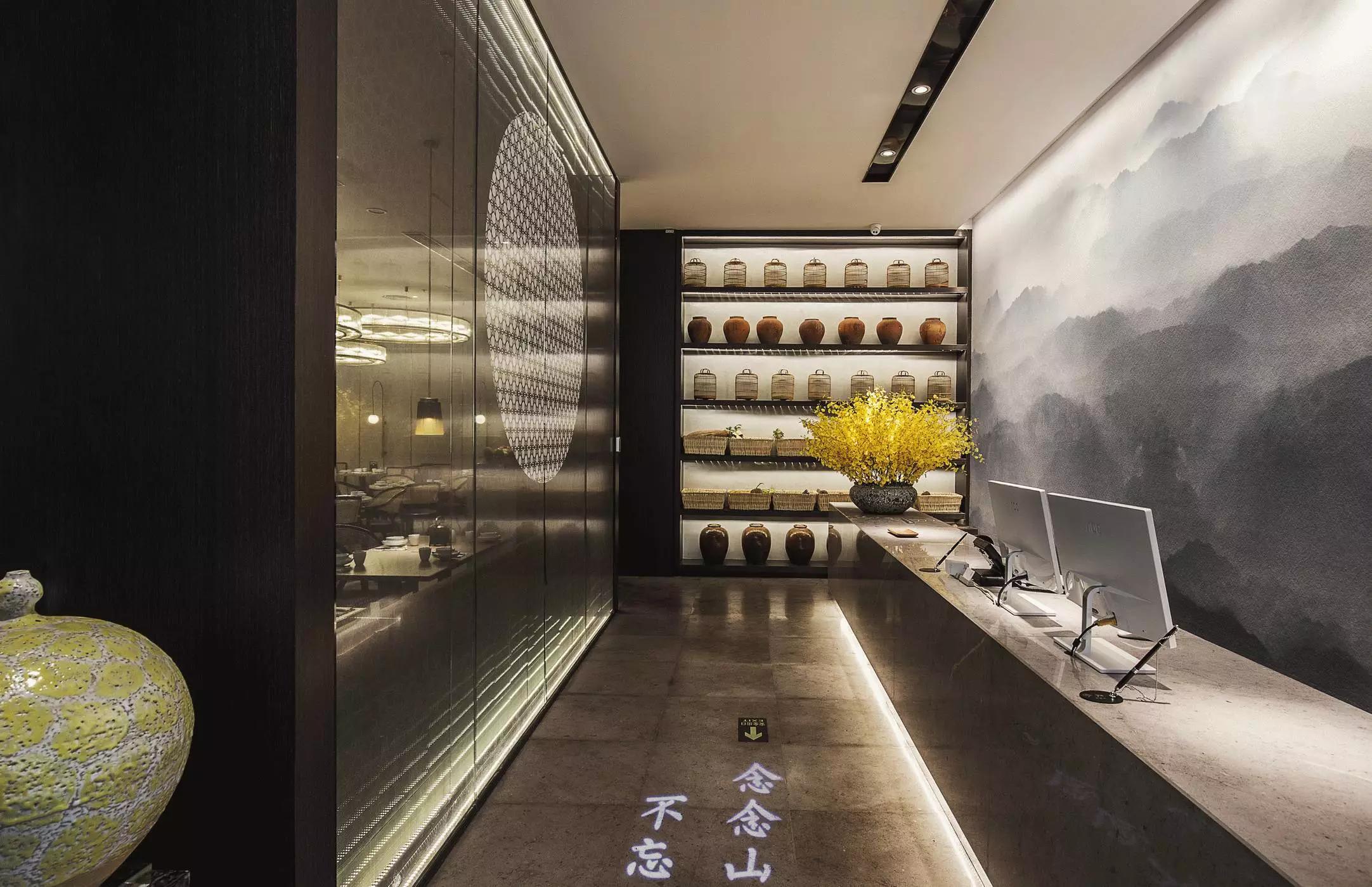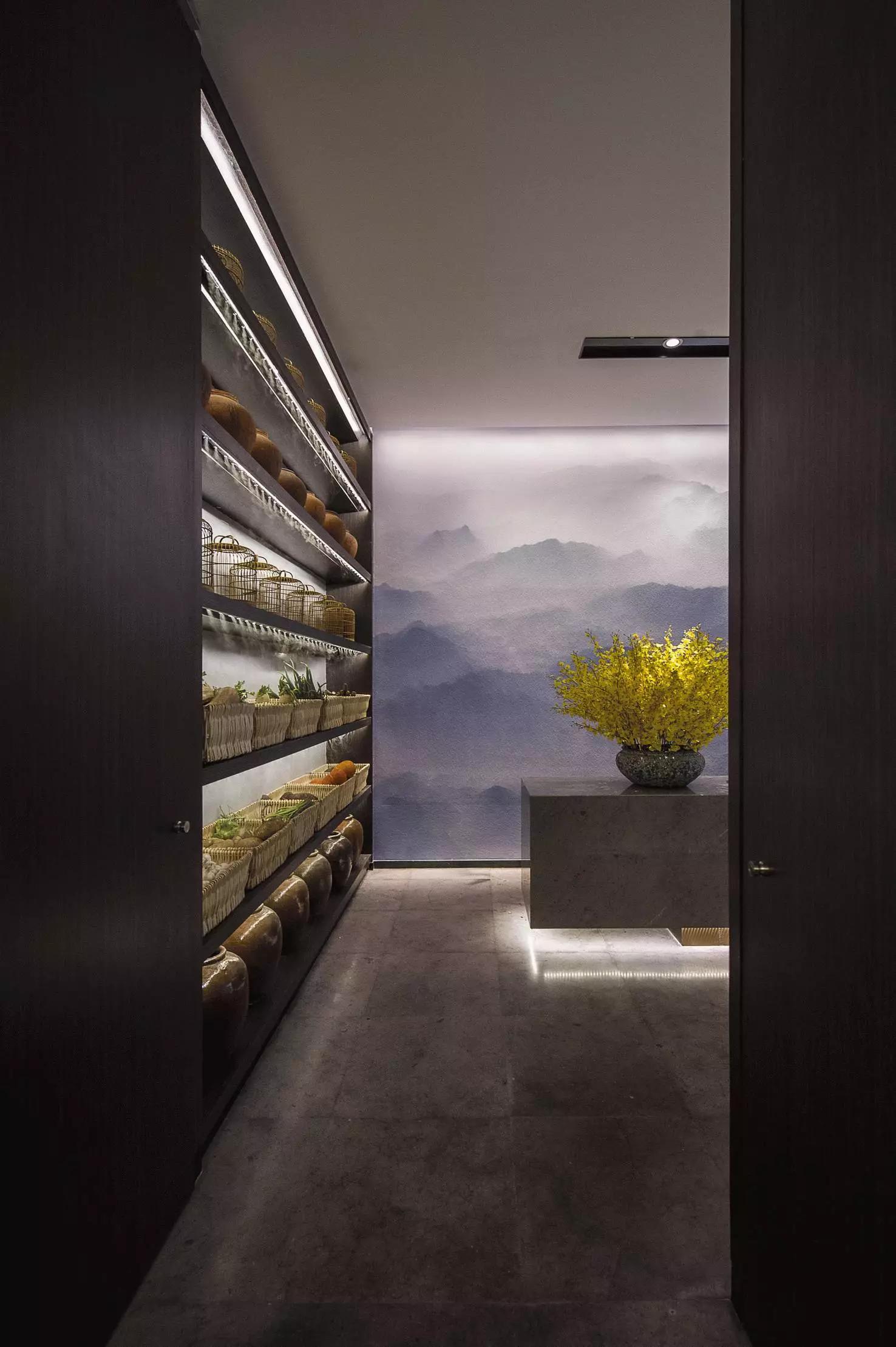 設計中廣泛使用了灰藍色調的石材,地磚,皮革,墻板,結合清新的藤編,厚重的木材,充滿質感的不銹鋼以及別致的燈具和光線,讓整個空間既清新優(yōu)雅又不失質樸,讓人雖身處鬧市卻仿佛置身于海的廣渺與山的深幽,又始終籠罩在一層淡淡的氤氳不去的“鄉(xiāng)愁”之中。
