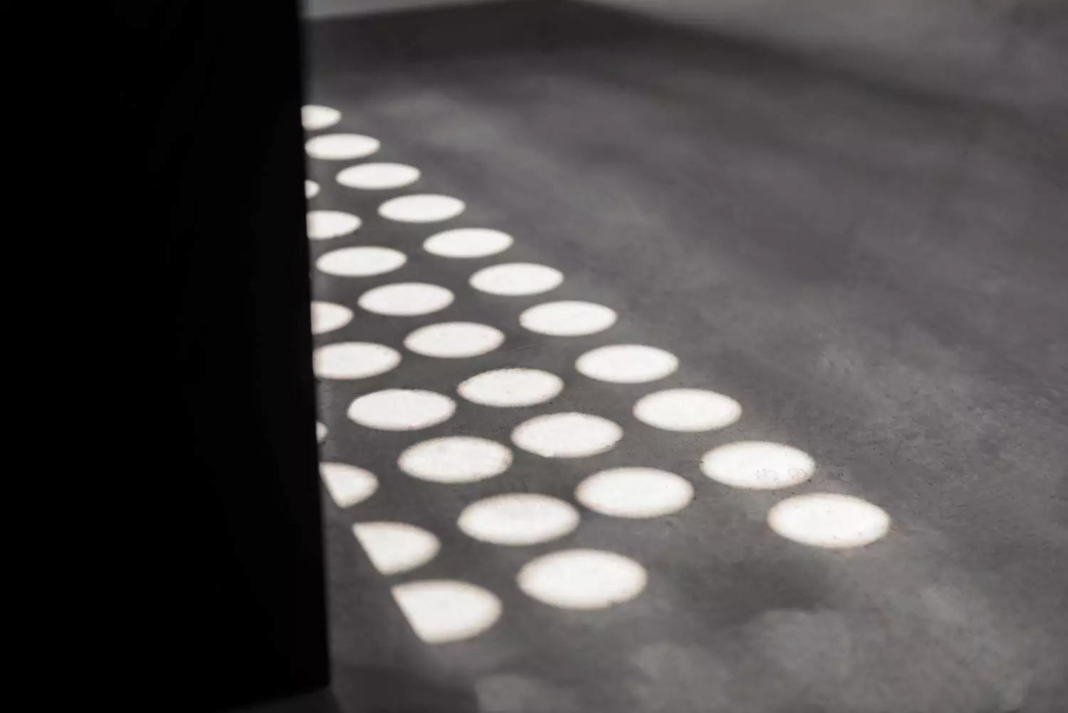 樓頂大小不一的圓孔讓自然光遊蕩在樓梯上,最大限度地借光入室。圓光束如同舞臺的聚光燈,它引導(dǎo)人們聚焦樓梯的肌理細(xì)部,也使人隨光前行、探究空間。
