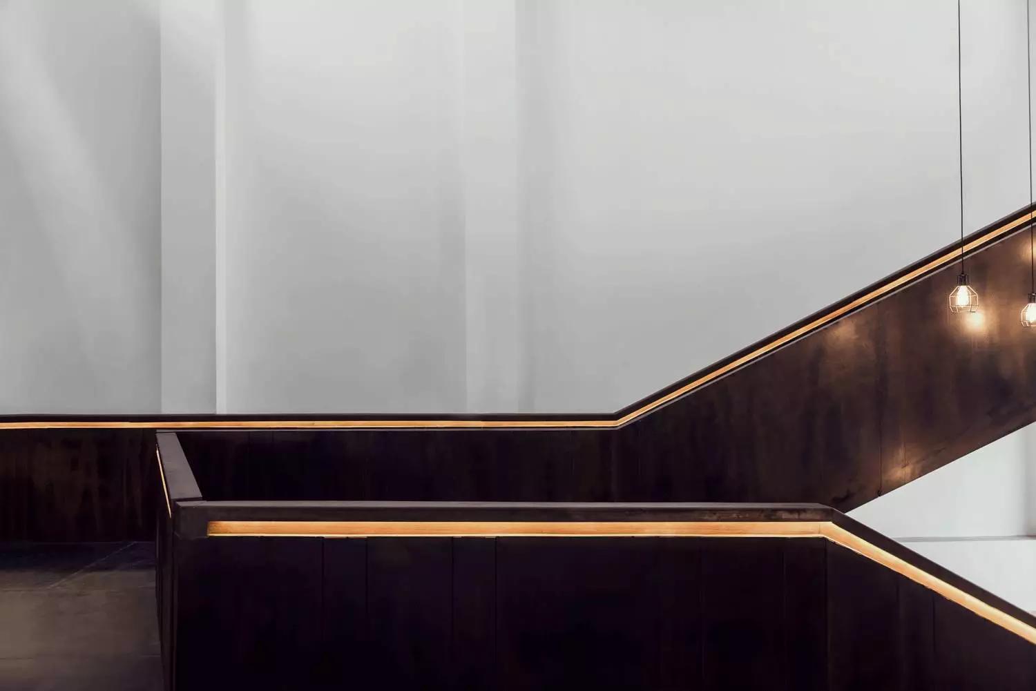 直線組合而成的吊燈利落的拉伸在樓梯中部,與不斷變化、充滿戲劇色彩的自然光互相補充,吊燈的照明使空間更平衡與緩和,穩(wěn)定了光影變化中的視覺感受。