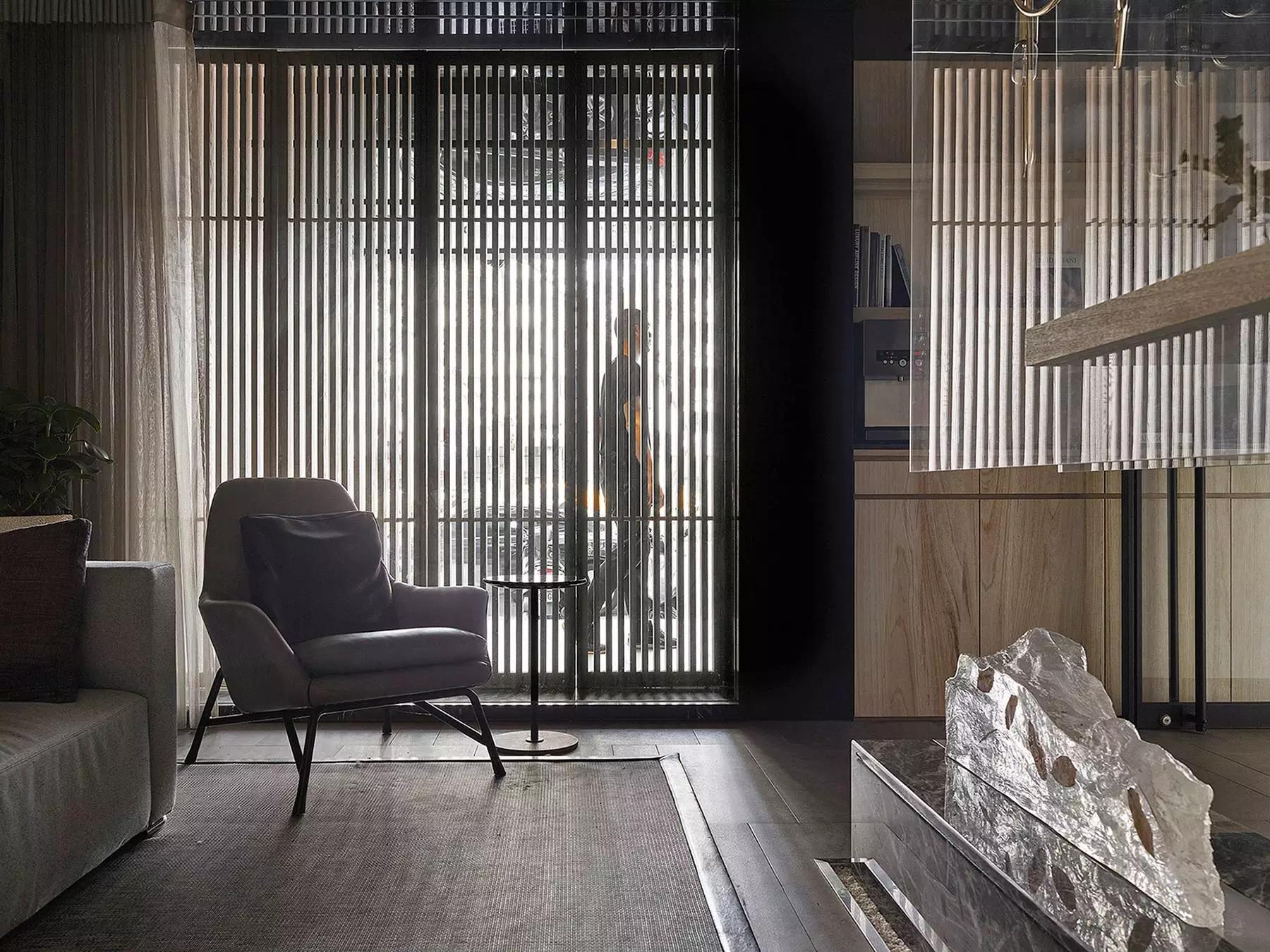 將玄關(guān)刻意退縮于室內(nèi)、入口大門轉(zhuǎn)向,而產(chǎn)生一進一景之空間體驗層次,寬闊的騎樓面積與門口的虛空間,未踏入空間卻已感受沈穩(wěn)安定。